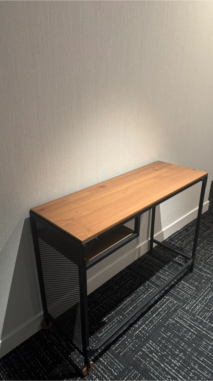 This console table features a natural wood top and a sturdy black metal frame. It includes a lower shelf for extra storage. Perfect for entryways or behind a sofa!