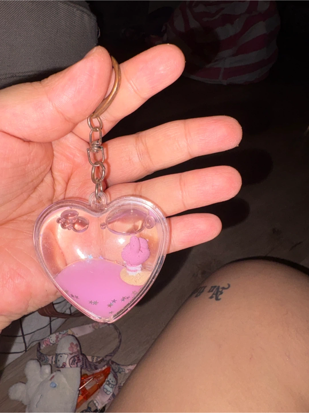 This is a cute heart-shaped keychain filled with pink liquid and glitter. It has a small pink figurine inside and is attached to a metal keyring. It's a fun accessory for your keys or bag!