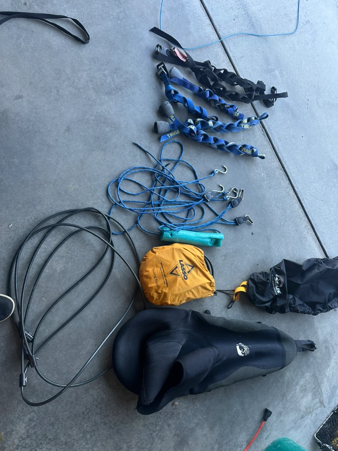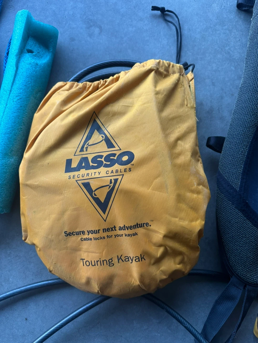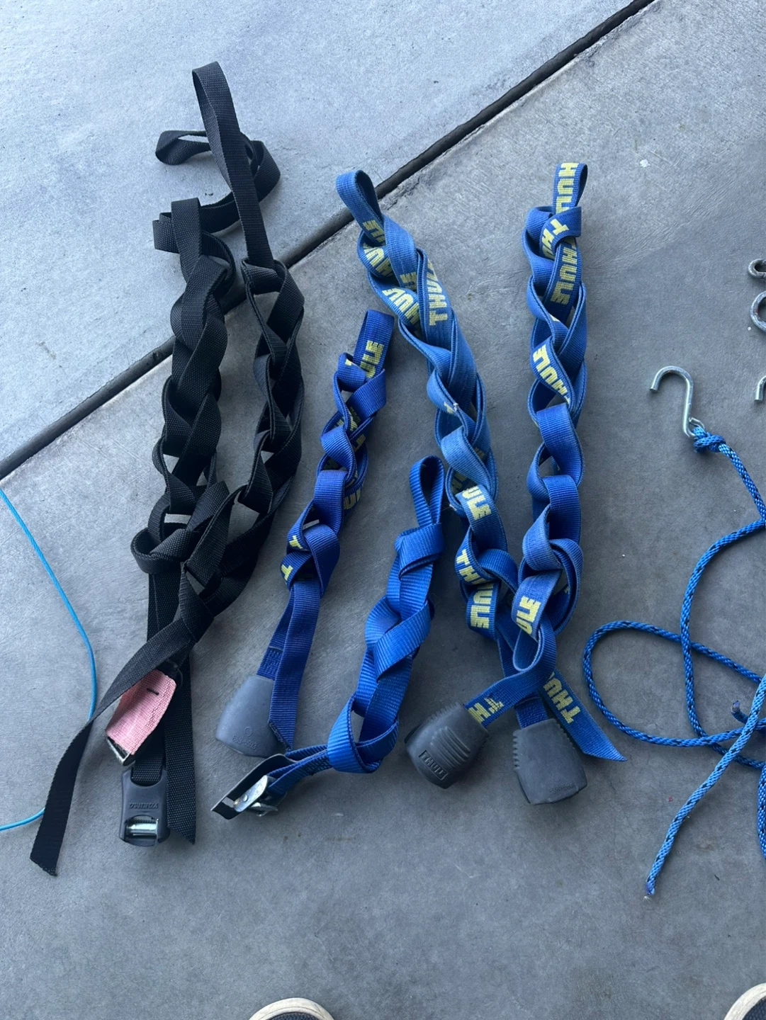 Three blue Thule tie-down straps with ratchets and one black tie-down strap. Includes two Lasso security cables for touring kayaks. Also comes with a Seals Nylon Cockpit Cover 1.4 and a blue foam float. Everything you need to secure your watercraft!