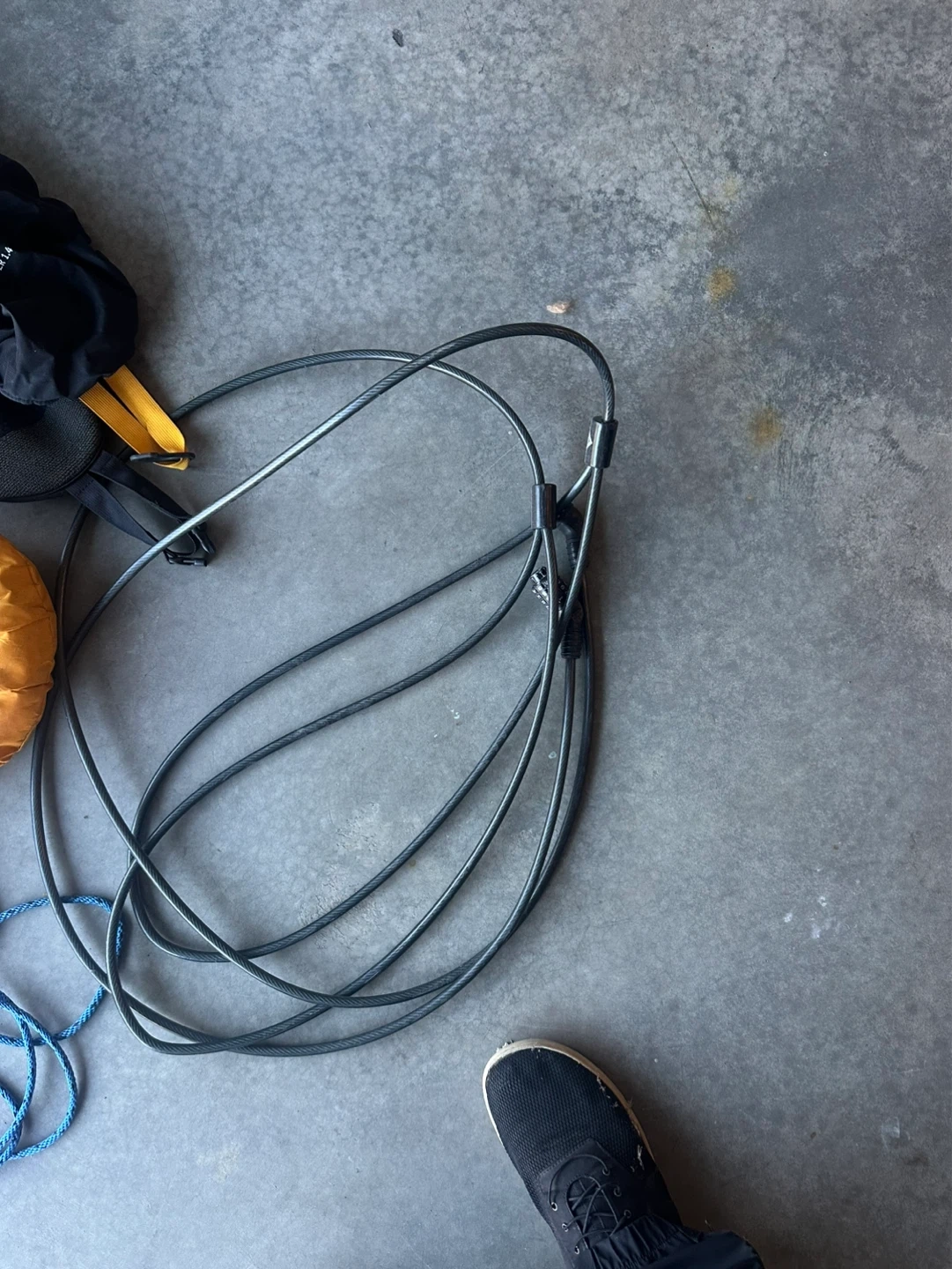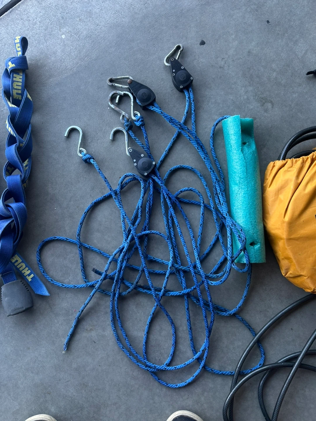 Three blue Thule tie-down straps with ratchets and one black tie-down strap. Includes two Lasso security cables for touring kayaks. Also comes with a Seals Nylon Cockpit Cover 1.4 and a blue foam float. Everything you need to secure your watercraft!
