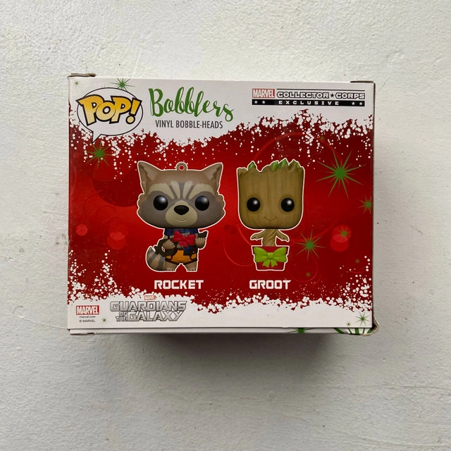 New in box Groot and Rocket Bobblers. Not advertised but are actually usable as Christmas ornaments for your Christmas tree (probably hence the sub-line ‘Bobblers’. Cash Only, Parkdale pickup. Check out my other funko listings