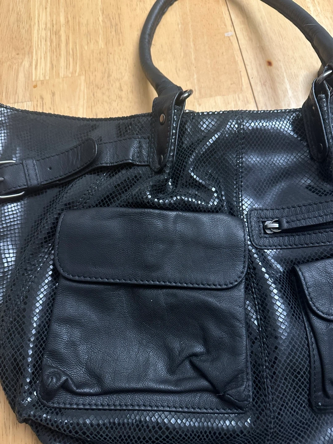 Spacious and sturdy vintage purse with a faux snakeskin texture. Lots of compartments, and it snaps together to keep items from falling out. I have too many bags but hoping someone loves this bag as much as I do!