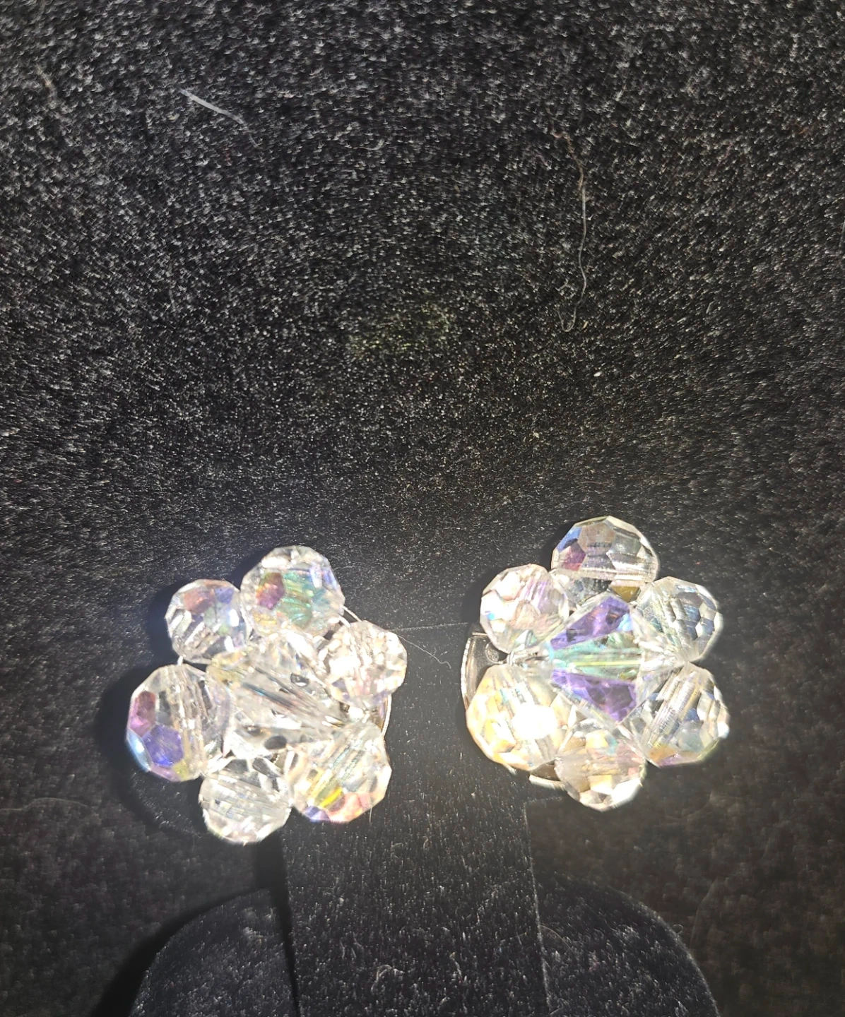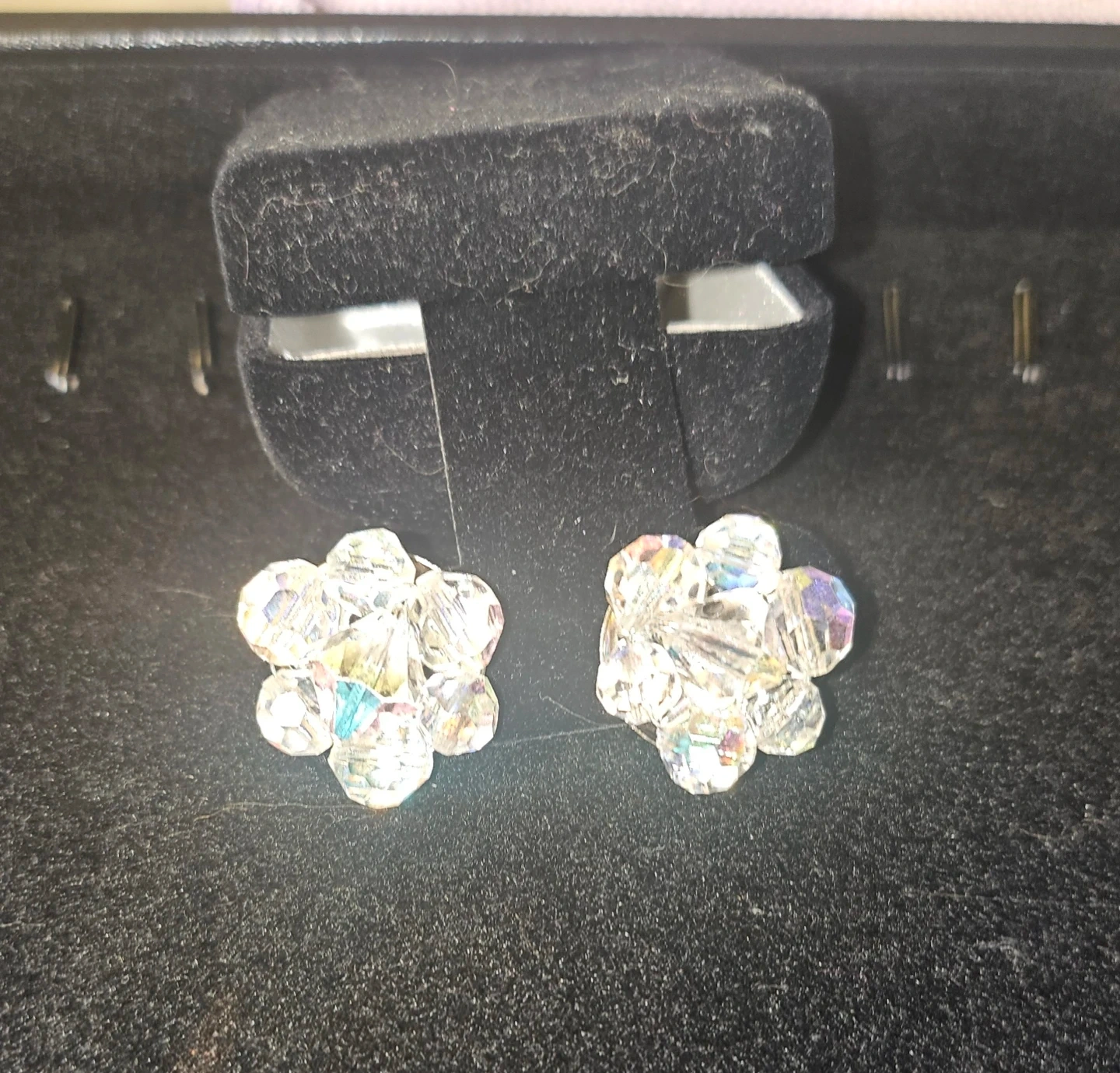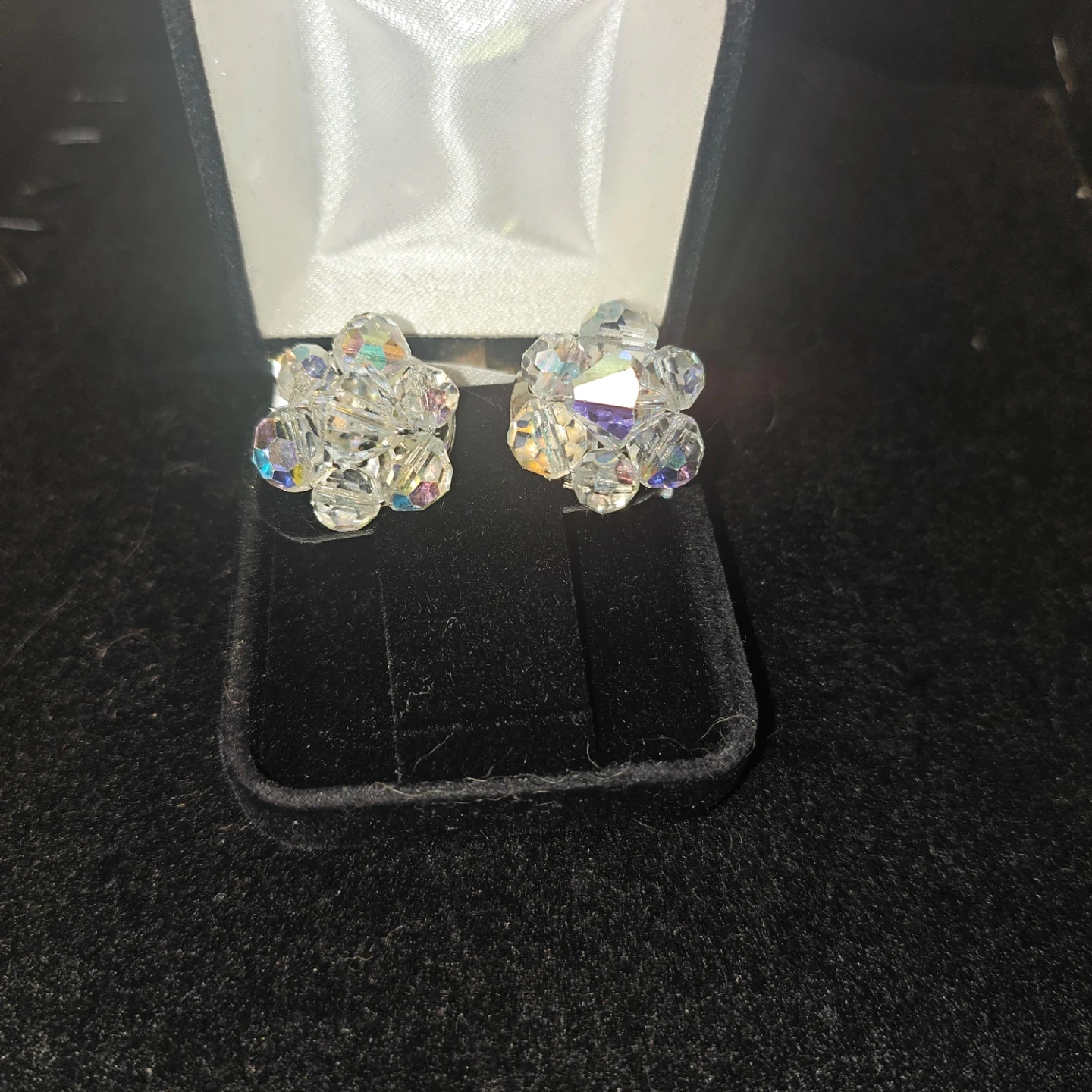 These are a beautiful pair of vintage clip-on earrings! They feature aurora borealis crystals in a lovely flower design. Perfect for adding a touch of sparkle to any outfit!