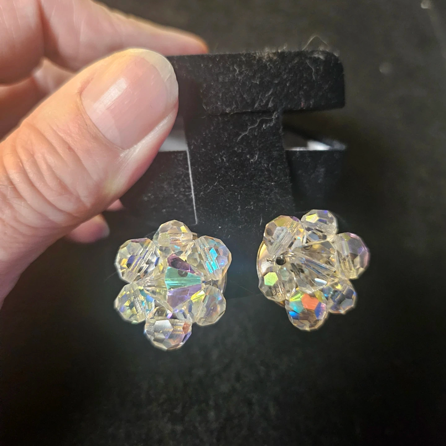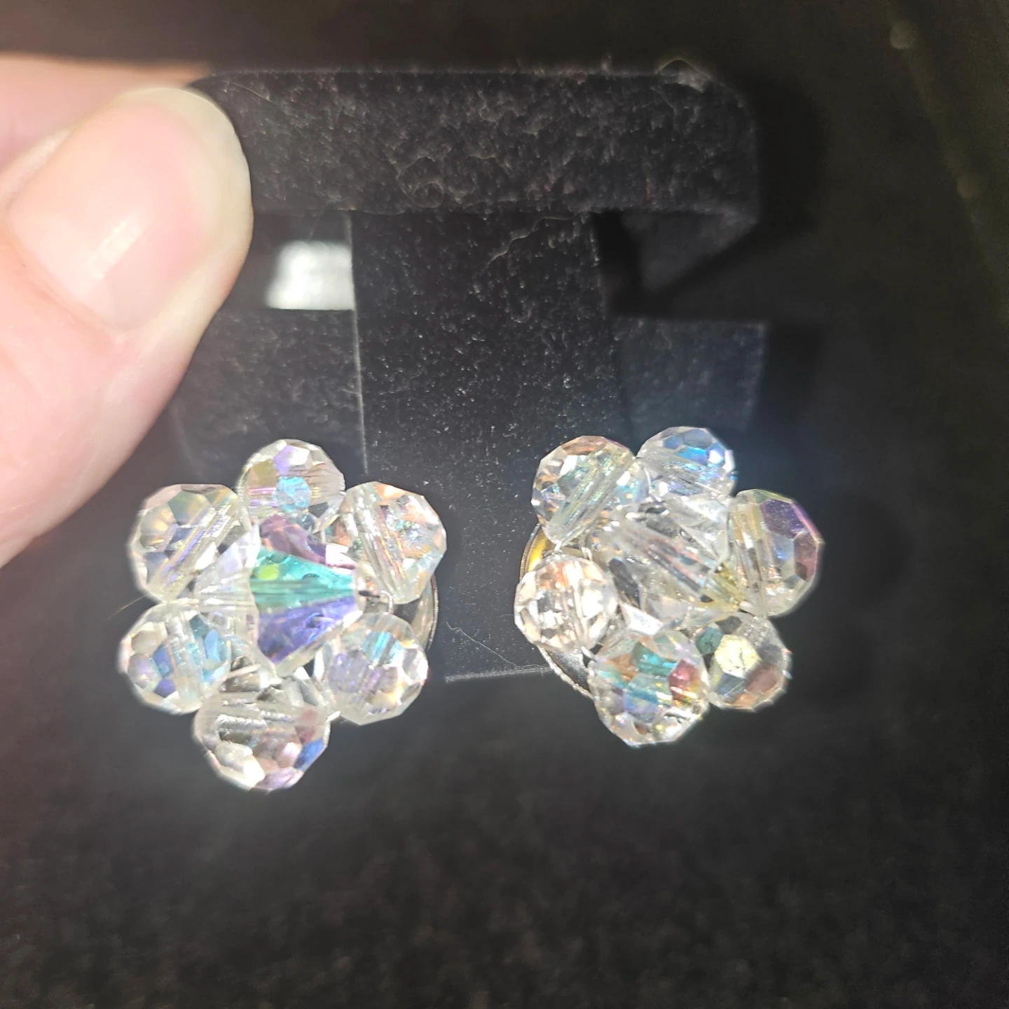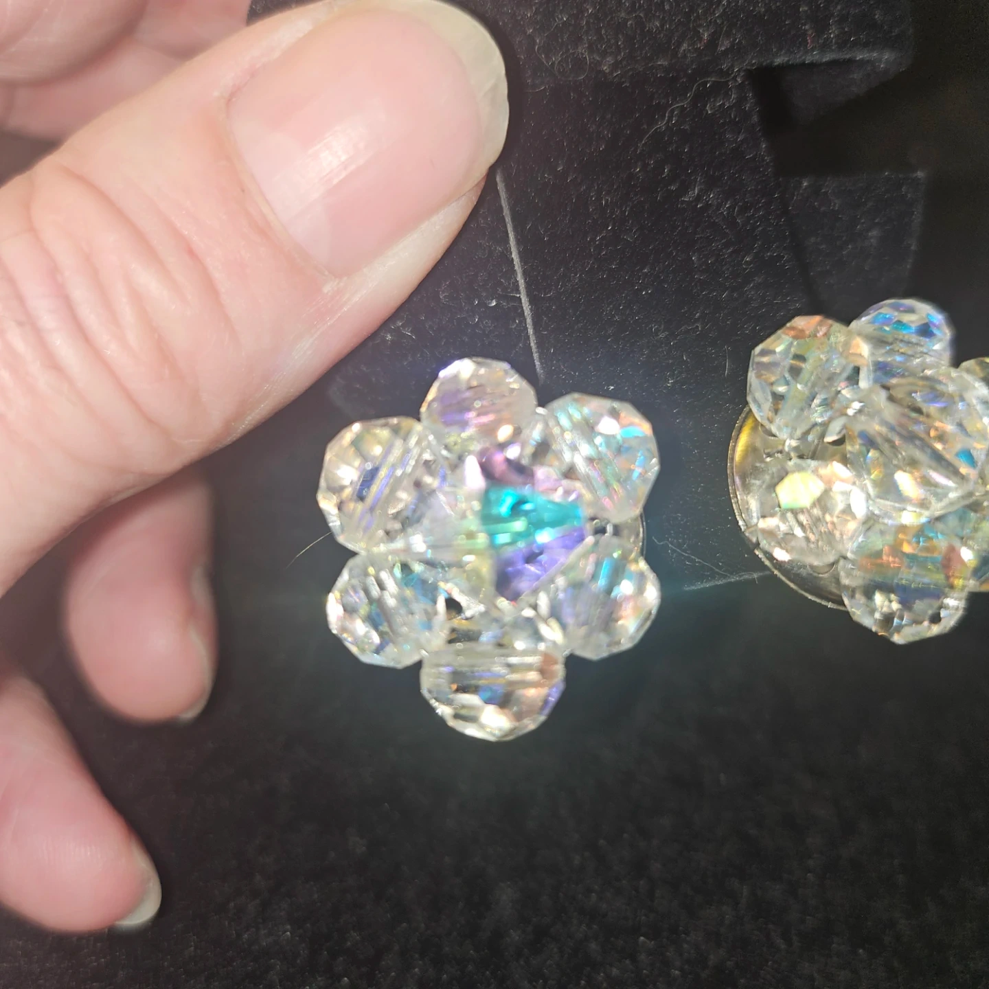 These are a beautiful pair of vintage clip-on earrings! They feature aurora borealis crystals in a lovely flower design. Perfect for adding a touch of sparkle to any outfit!