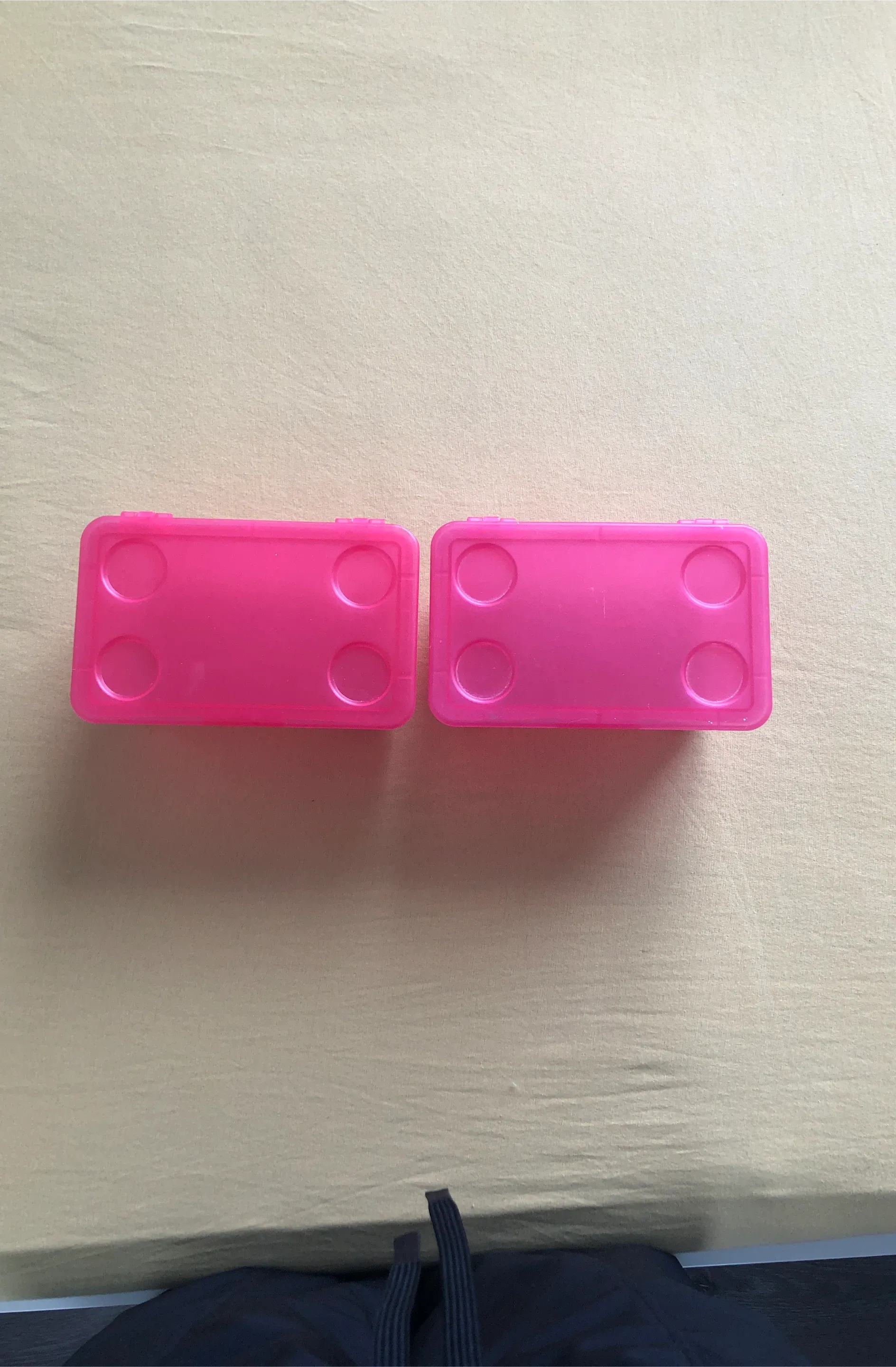 Two IKEA pink plastic storage containers. They each have four circular indentations on the top surface. These would be handy for small crafts or accessories!