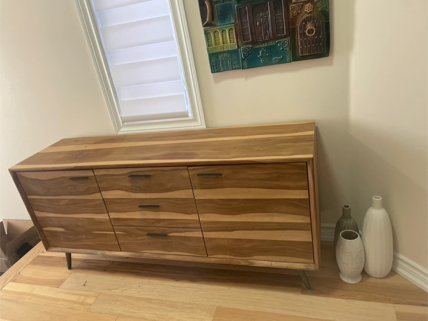 This stylish sideboard is made from solid wood with a unique striped grain pattern. It features six drawers for ample storage. The piece sits on slender metal legs. From structube