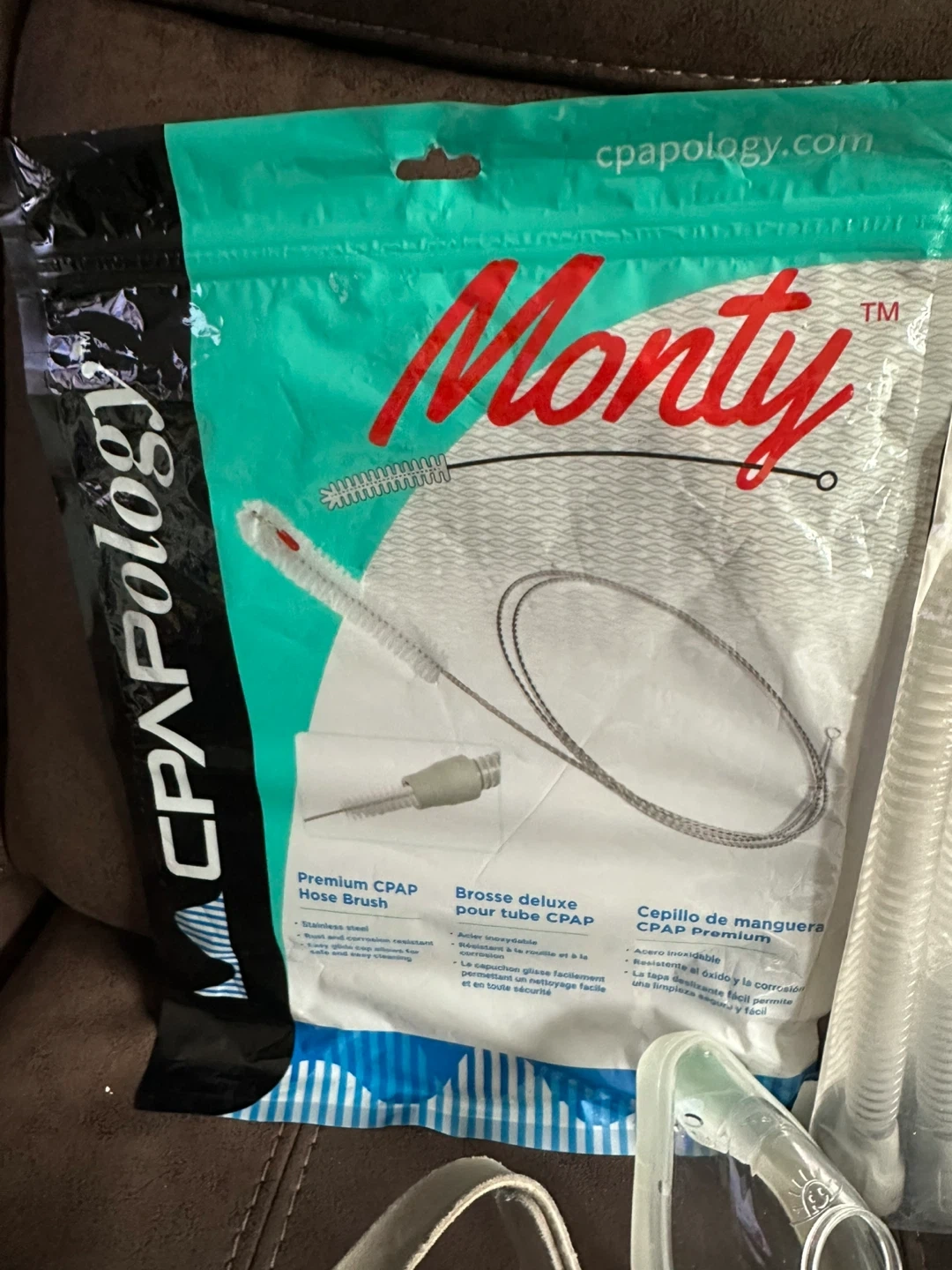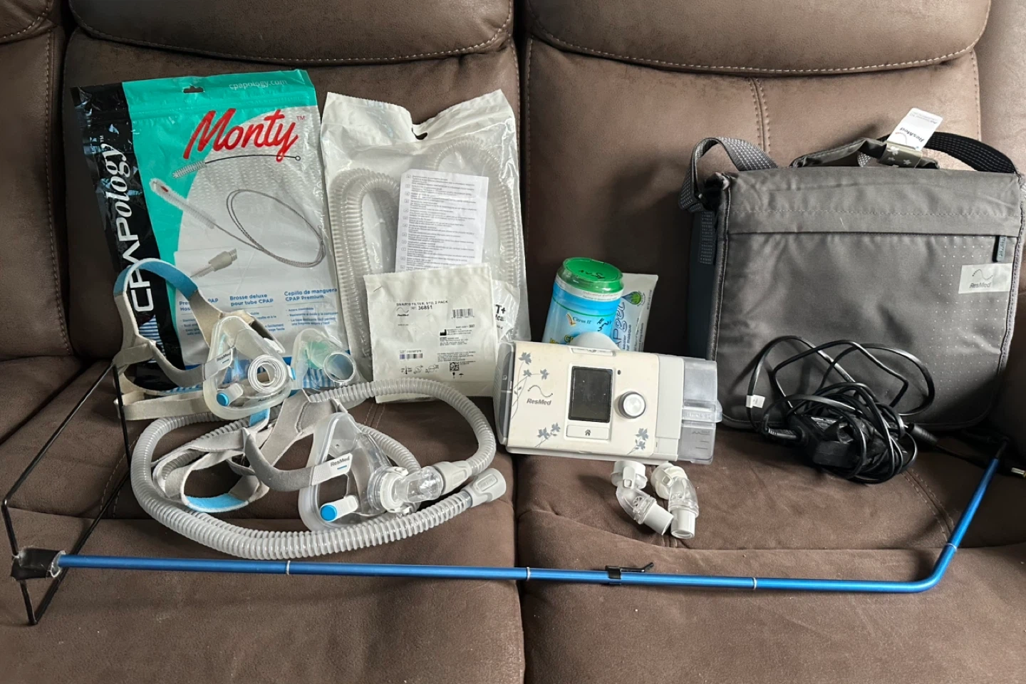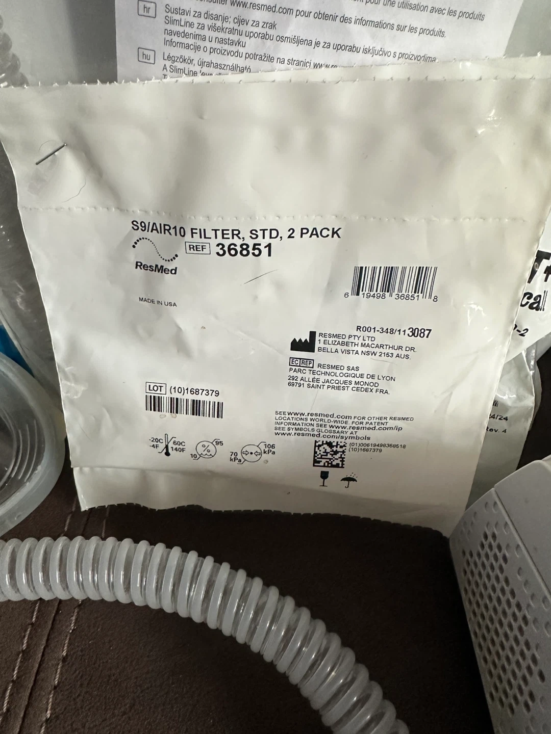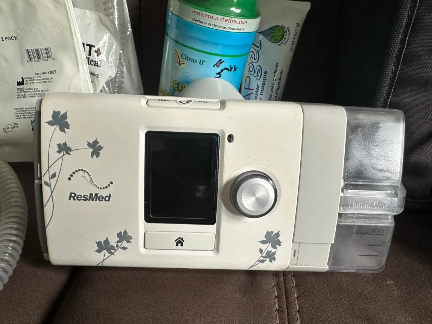 ResMed AirSense 10 CPAP machine in great condition and with a recently replaced water reservoir and lots of accessories both new and used including cleaning wipes, cleaning brushes, seal gel, masks, tubes, connectors, tube management stand, filters etc. (see photos)