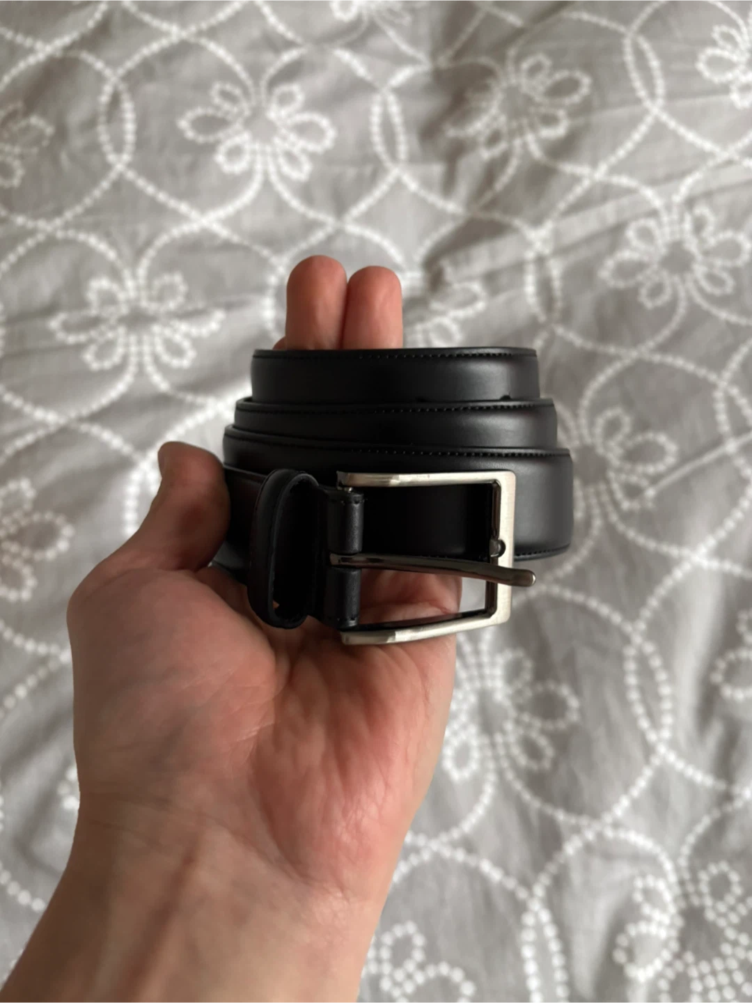 Selling a classic black leather belt. It's in great condition and ready to be worn! The buckle is a simple, sleek design in silver. Perfect to complete any outfit!