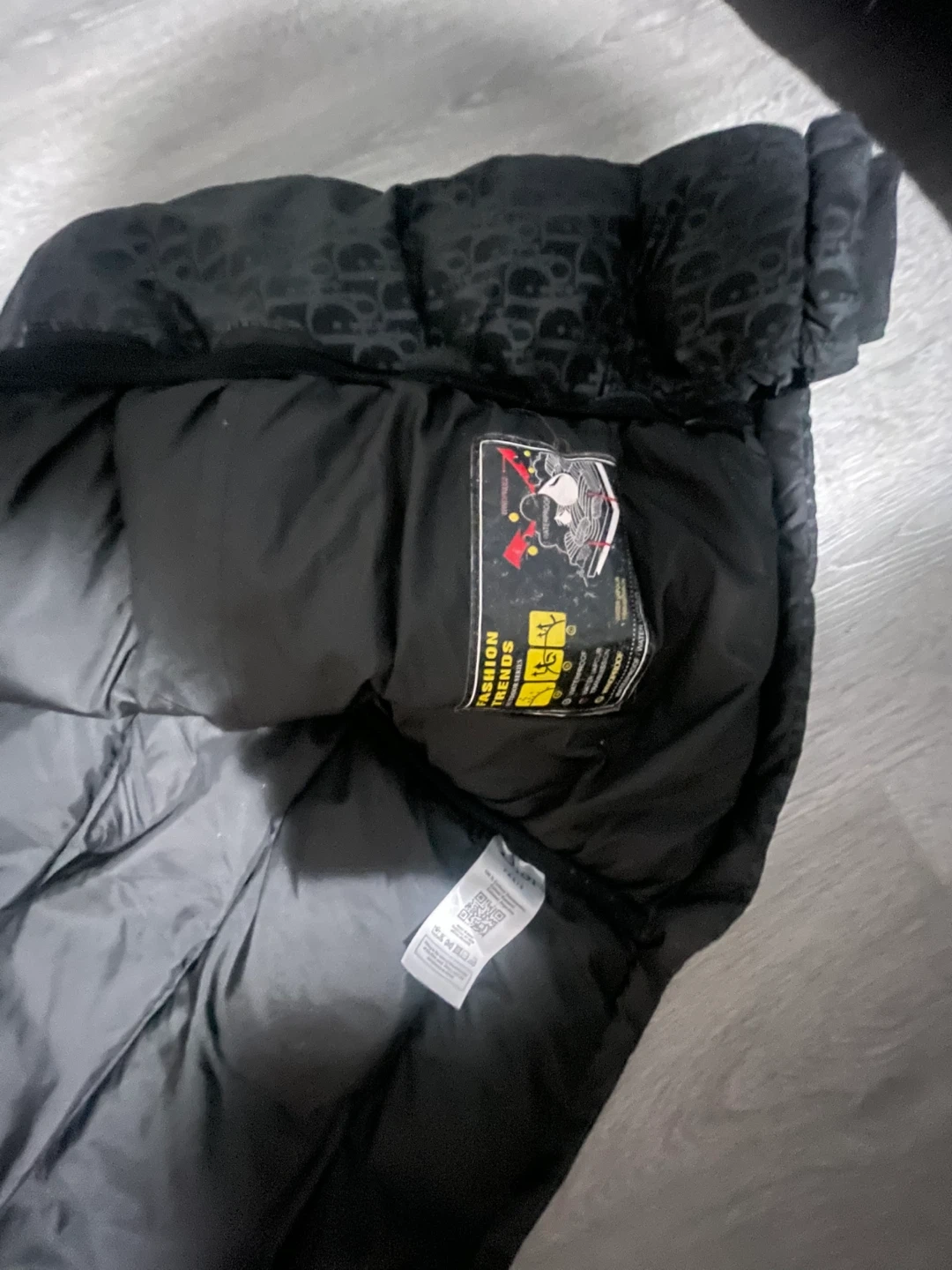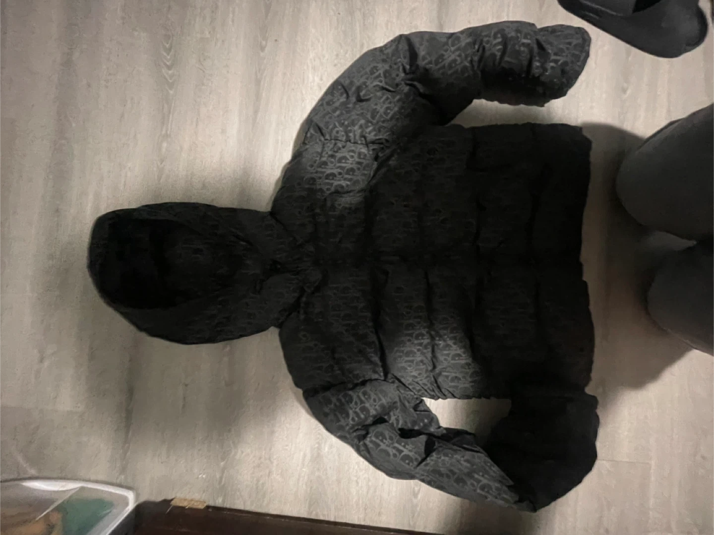 Selling a stylish Christian Dior puffer jacket in black. It's a size M and features the iconic Dior pattern. Perfect for staying warm and fashionable this winter! I’m down to trade also if you have anything, let me know if you have like a jacket or a hoodie or pants or anything let me know or even a phone. Let me know. Or send me your best offer.