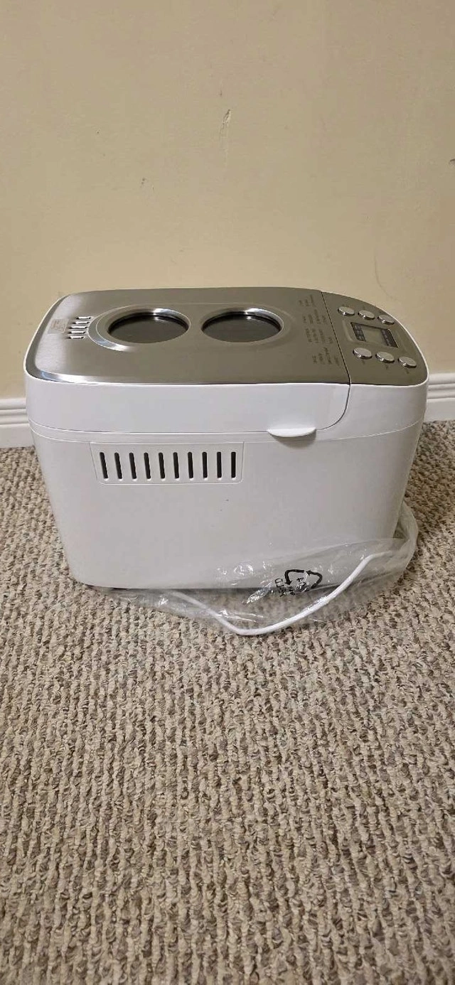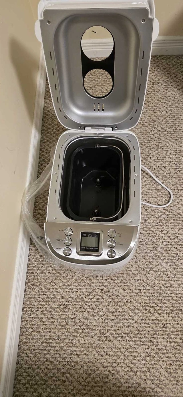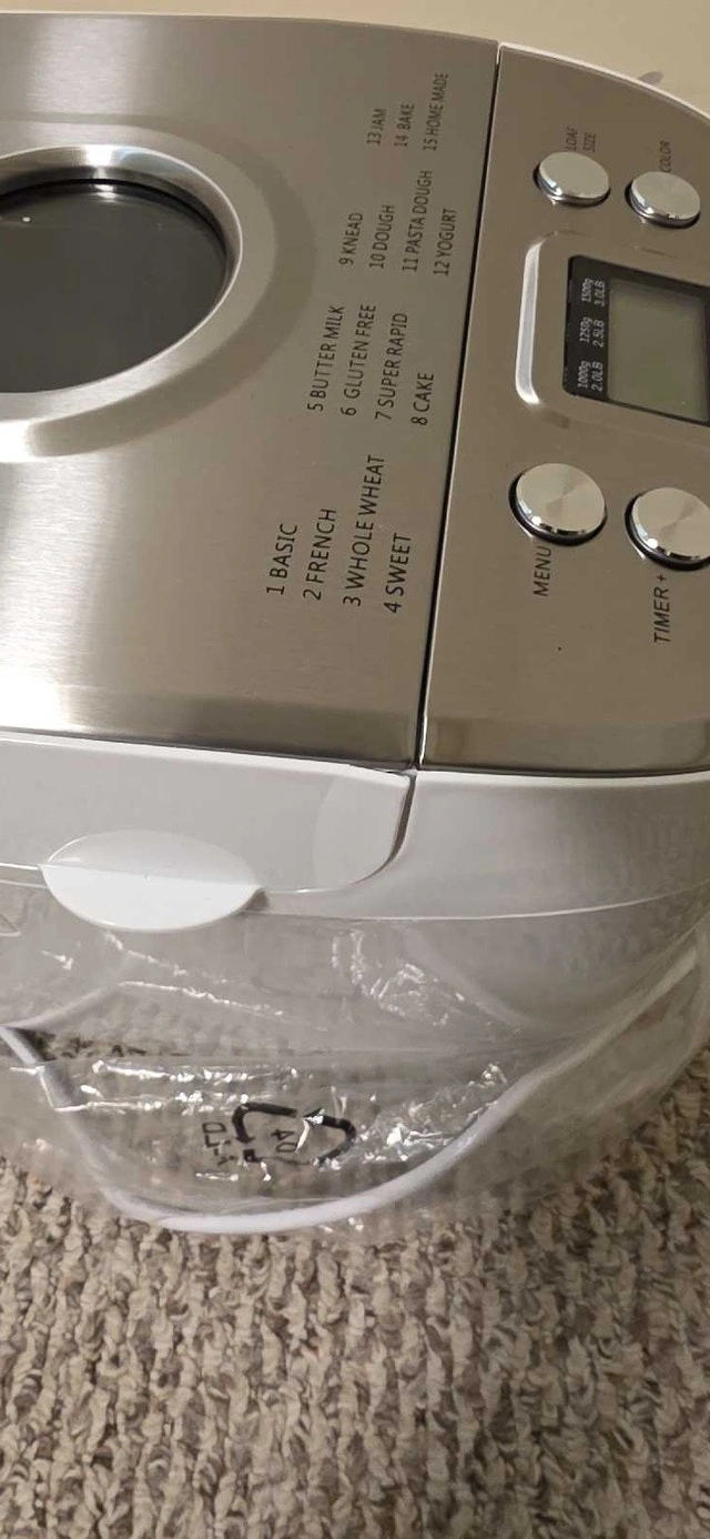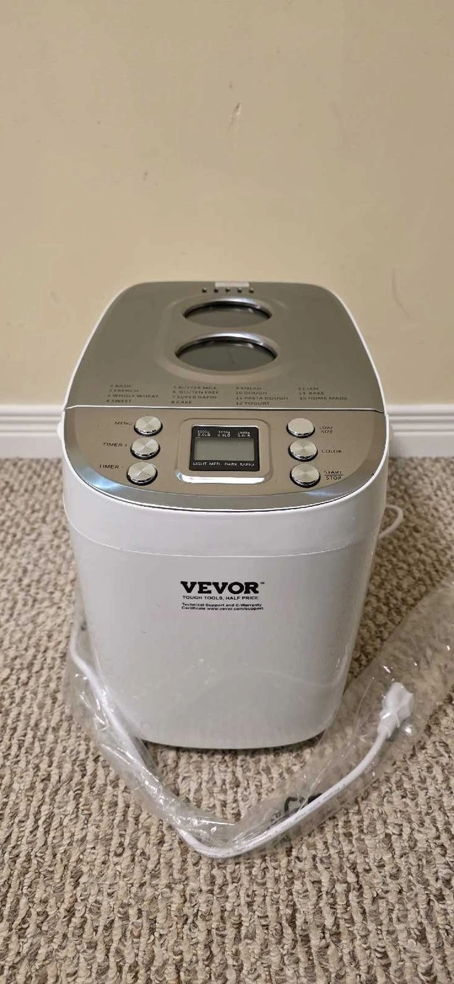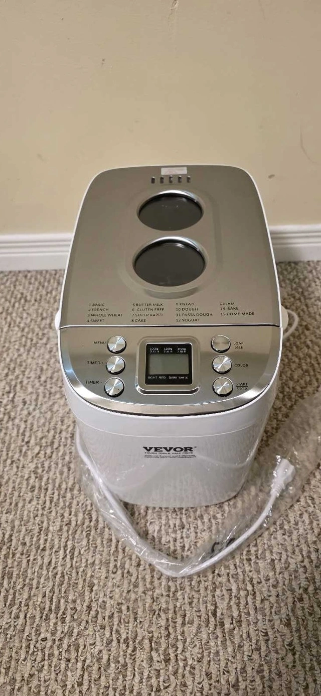 VEVOR 3 LB 15-in-1 Bread Maker in good condition. Used only a few times. There's minor damage on the right side of the opening lid, but it works great with no issues. Features 15 menu programs for various bread types, dough, jam, cakes, and more. It has one-key intelligent operation for seamless baking. Offers 3 capacity options (2lb, 2.5lb, 3lb) and 3 crust color settings. The inner pot is food-grade ceramic, durable, and non-stick. The kneading blade is also food-grade Teflon. Includes a 15-hour smart reservation/delay start and a 1-hour automatic keep warm function. It also has a power interruption memory function. The machine will beep to remind you when to add auxiliary ingredients.