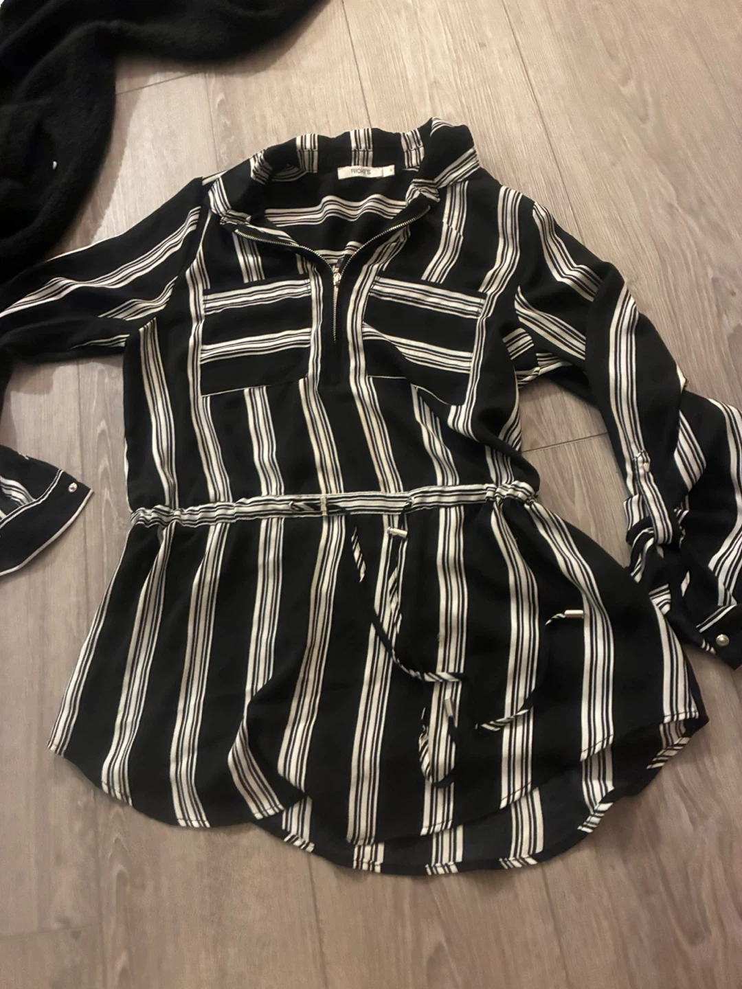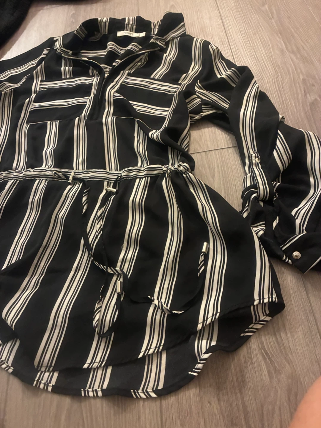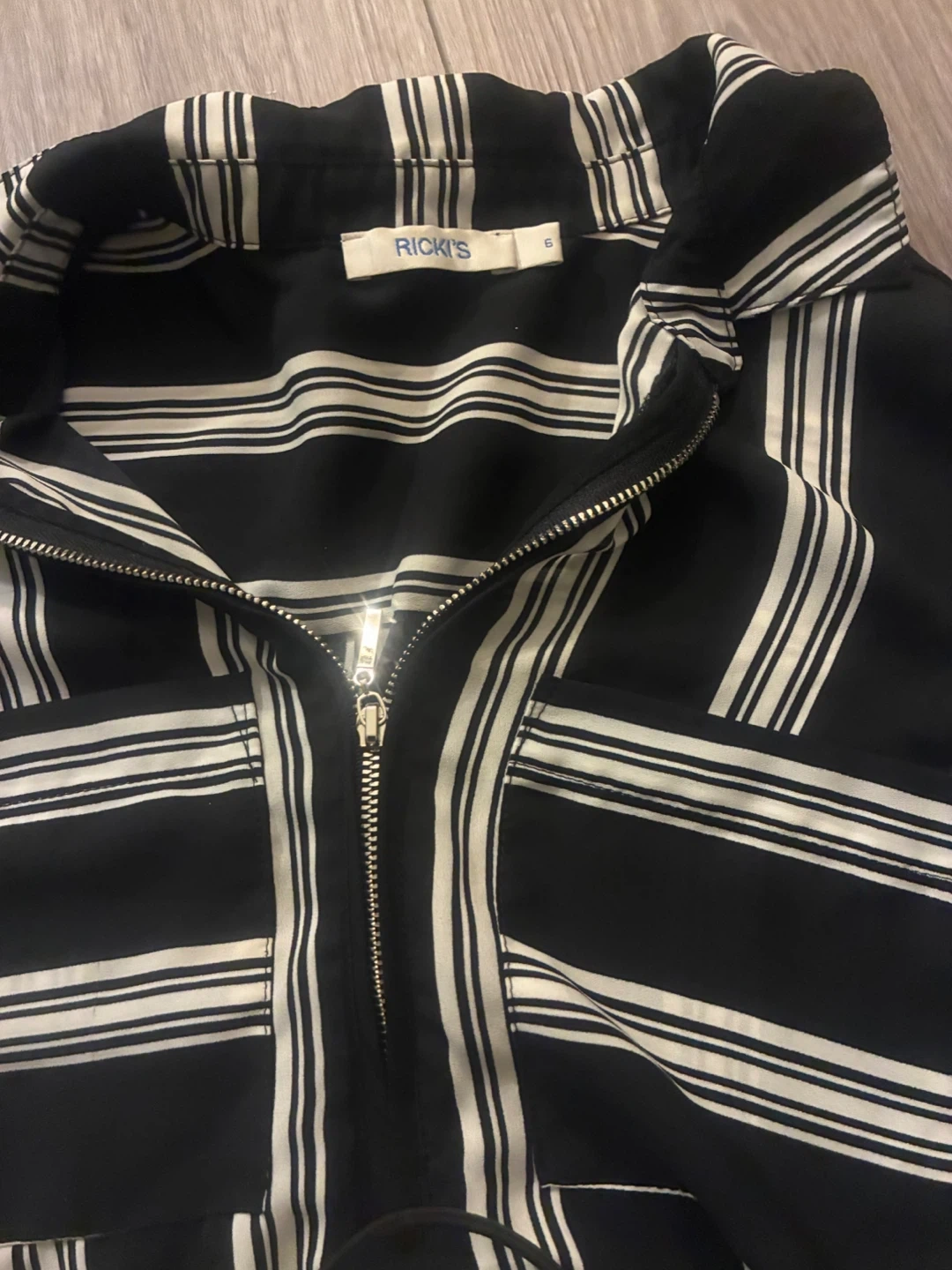 This Rick's shirt has a classic black and white stripe pattern. It features a quarter-zip neckline and a tie waist. It's a size 6. perfect for summer evenings because of the zip line you can use any top underneath if you want to as well as top and ready to go.