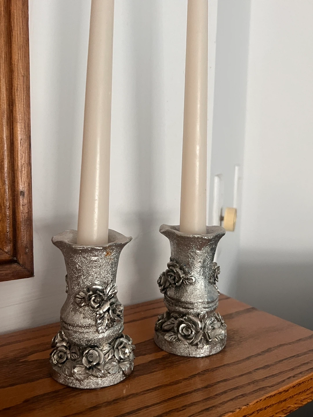 These candlestick holders feature an ornate silver tone finish with detailed rose embellishments. They're designed to hold taper candles. These would add a lovely decorative touch to a mantle or dining table.
