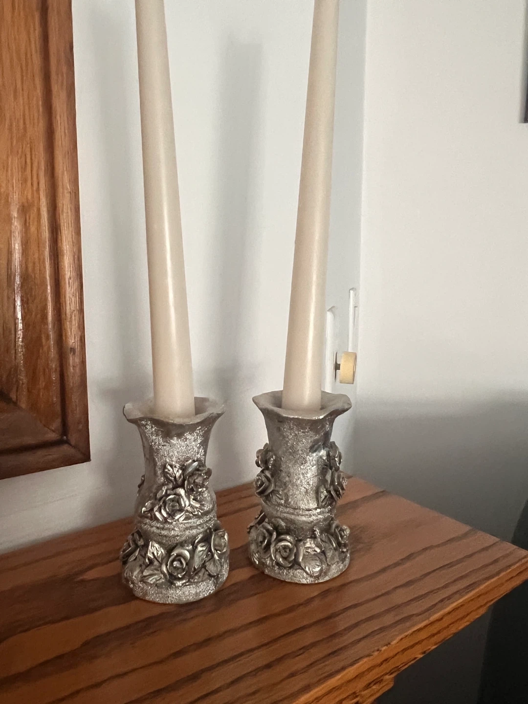 These candlestick holders feature an ornate silver tone finish with detailed rose embellishments. They're designed to hold taper candles. These would add a lovely decorative touch to a mantle or dining table.