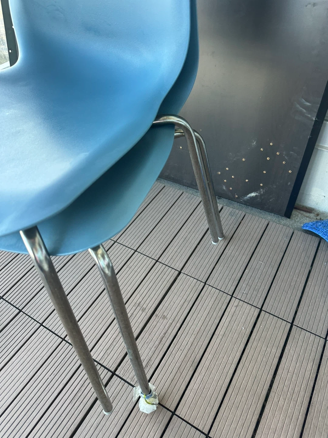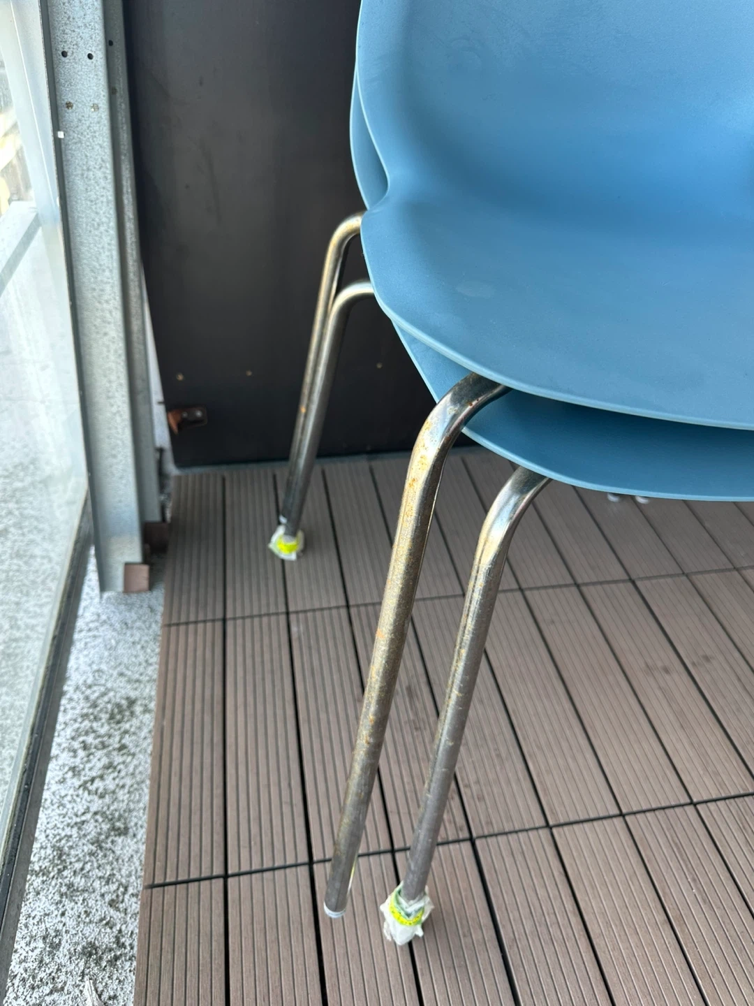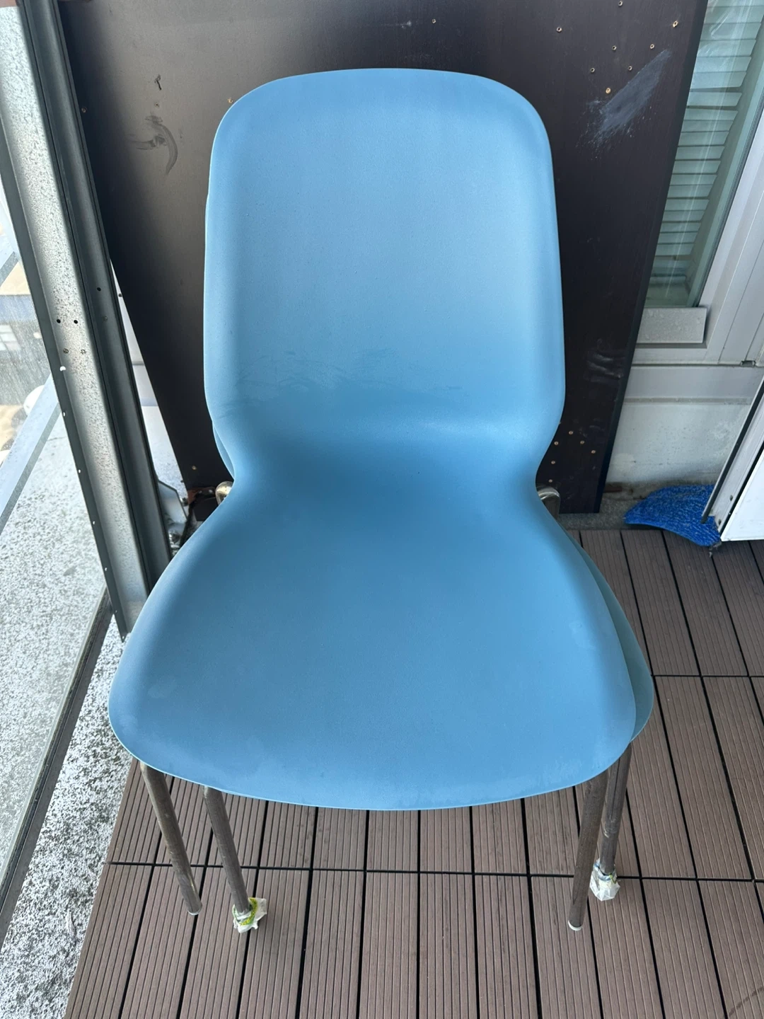 Two light blue plastic chair with sturdy metal legs. It's lightweight and easy to move around. Great for extra seating at home or in an office space!