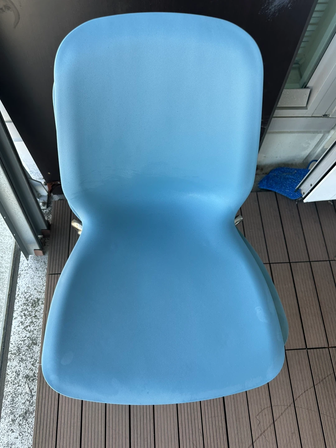 Two light blue plastic chair with sturdy metal legs. It's lightweight and easy to move around. Great for extra seating at home or in an office space!