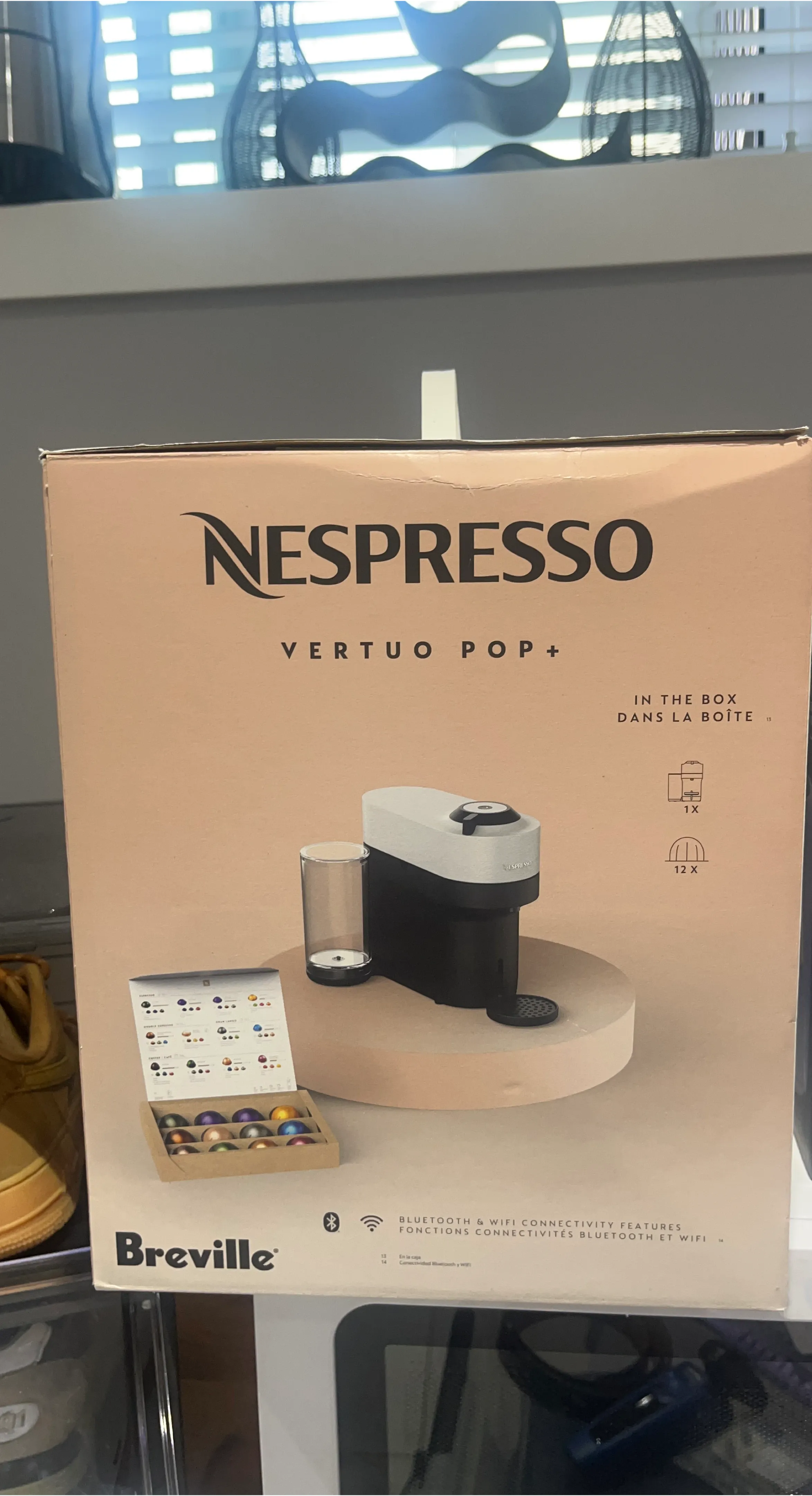 This Nespresso Vertuo Pop+ coffee machine comes in its original box. It features Bluetooth and WiFi connectivity for enhanced brewing options. A great addition to any kitchen!
