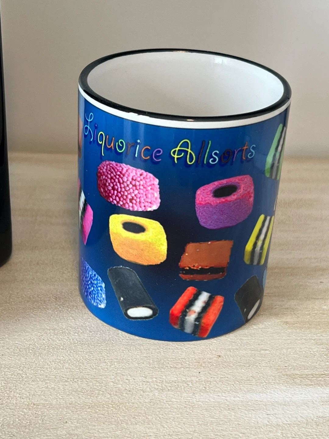 The jar is a black cube decorated with liquorice allsorts candies, and it comes with a lid. The mug is blue and also features liquorice allsorts designs. Perfect for any candy lover!