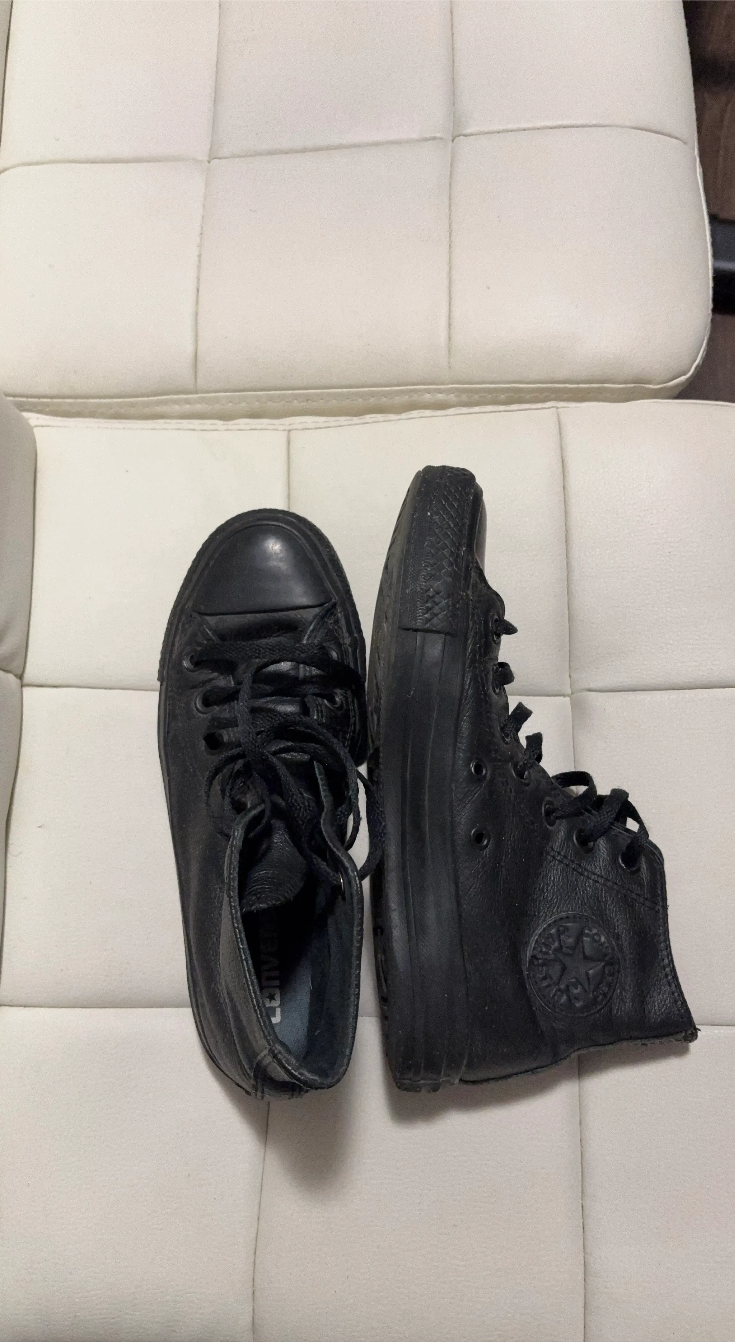 Selling a pair of Converse All Star high tops in black leather. They're in good condition and ready for a new owner!