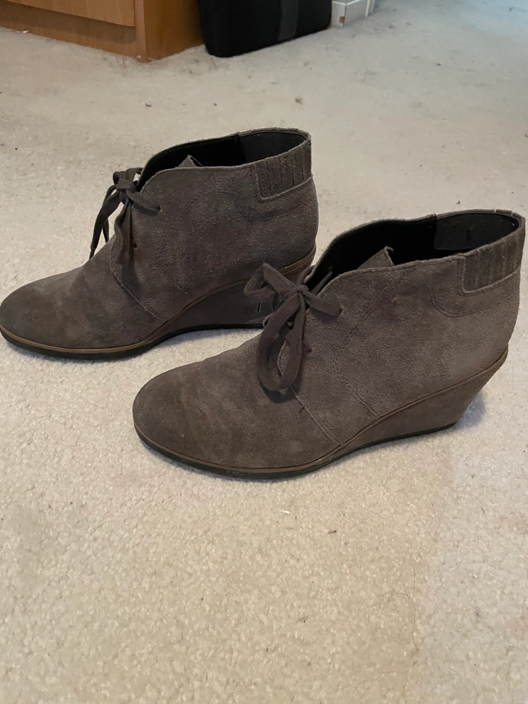 Selling a pair of Lucky Brand wedge ankle boots. They are a greyish brown colour and made of suede. Great for fall!