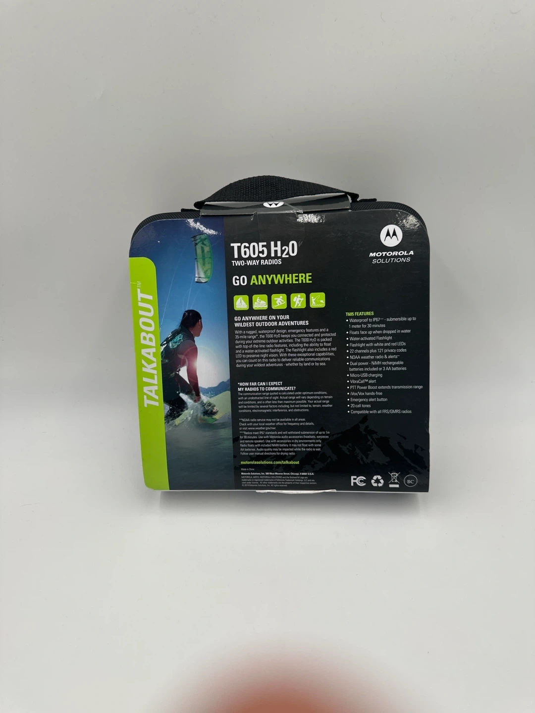 These Motorola Talkabout T605 H2O two-way radios are submersible and float. They come with a water-activated flashlight and NOAA weather alerts. Waterproof rating IP67.