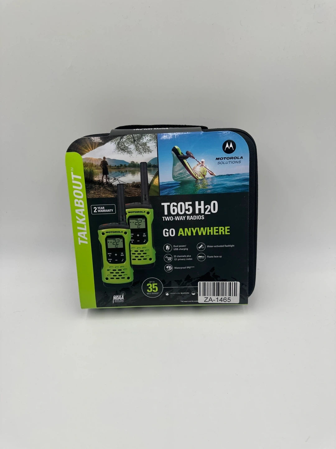 These Motorola Talkabout T605 H2O two-way radios are submersible and float. They come with a water-activated flashlight and NOAA weather alerts. Waterproof rating IP67.