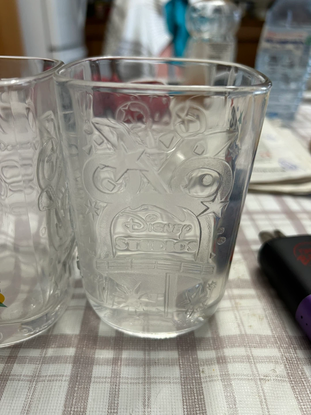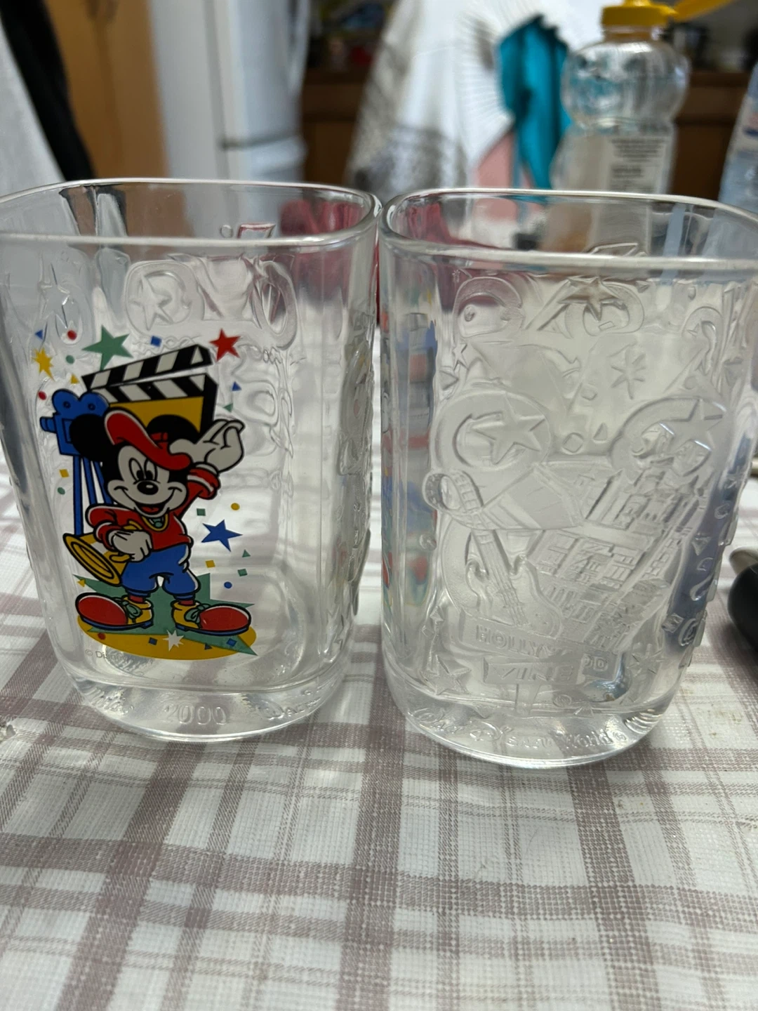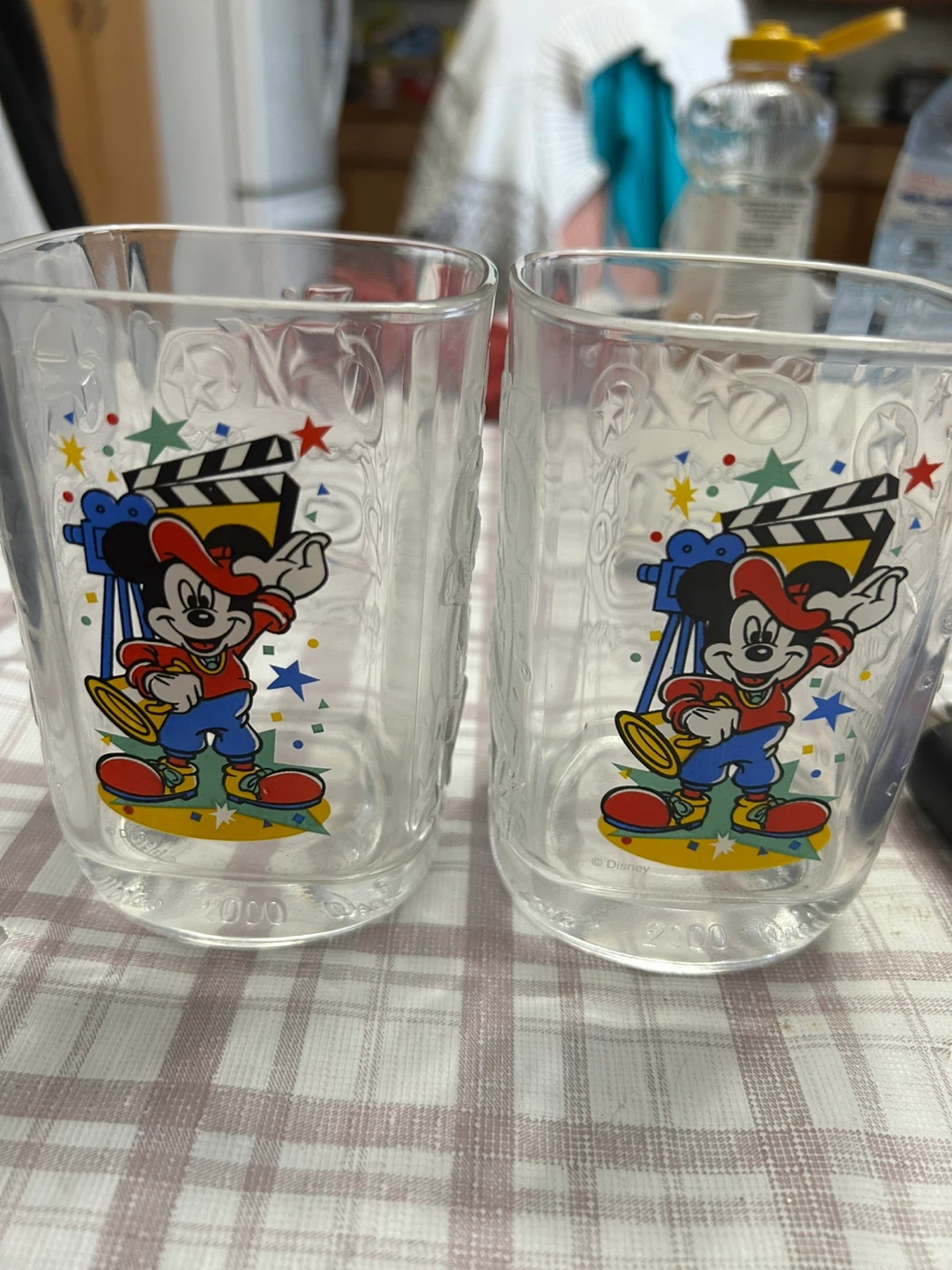 Set of two collectible Disney glasses featuring Mickey Mouse. These glasses have a classic design with "Disney Studios" embossed on one side and Mickey Mouse artwork on the other. They were made in the year 2000. Perfect for Disney fans and collectors!
