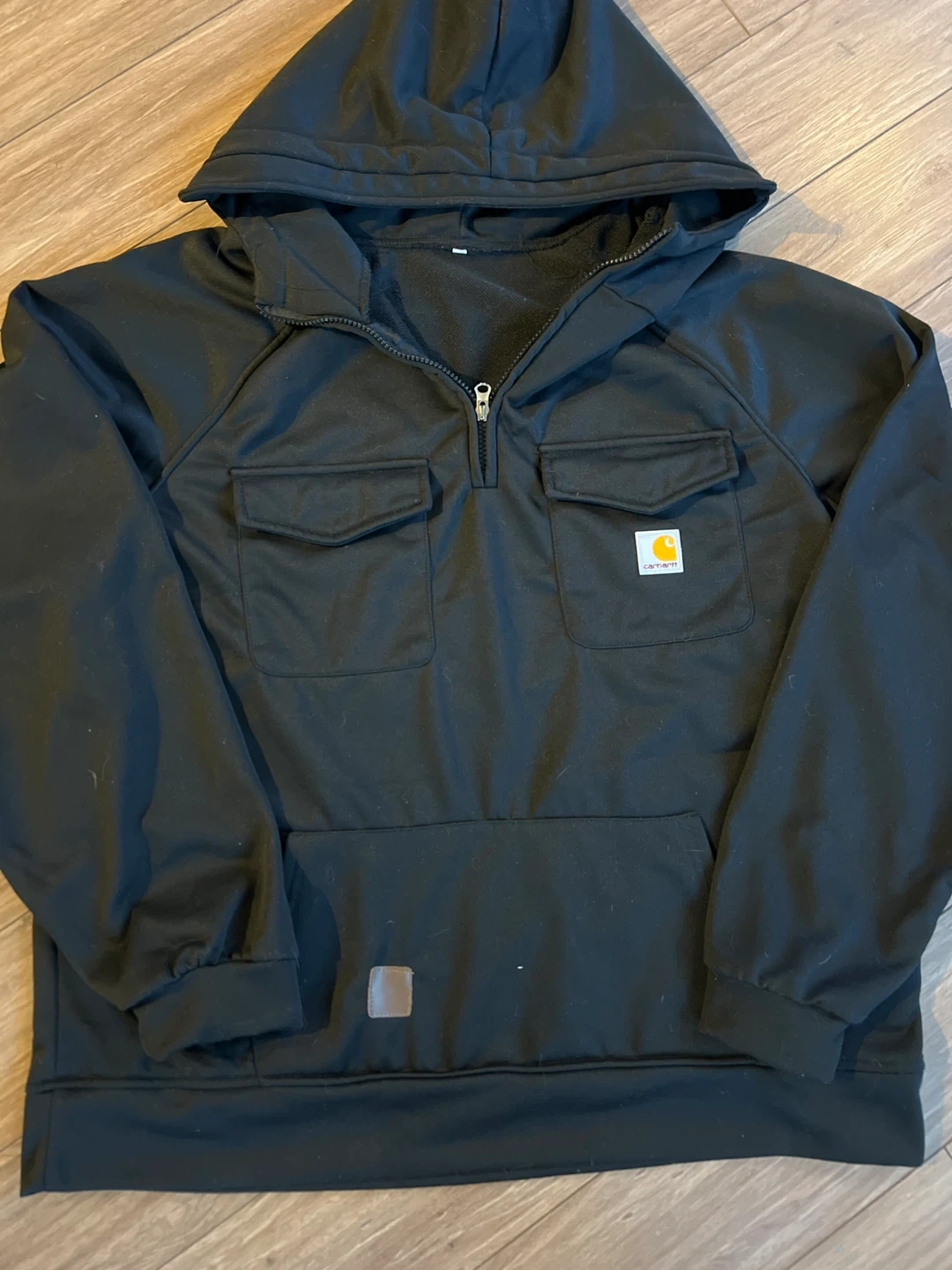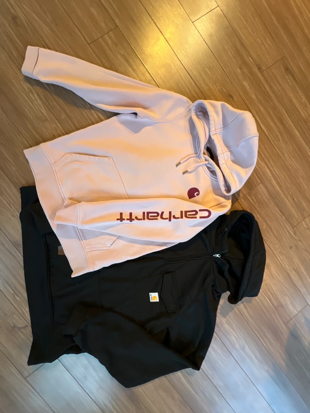 Bundle includes one black Carhartt quarter-zip hoodie and one pink Carhartt hooded sweatshirt. Both are size medium and made of a soft, comfortable material. Perfect for layering during cooler weather!
