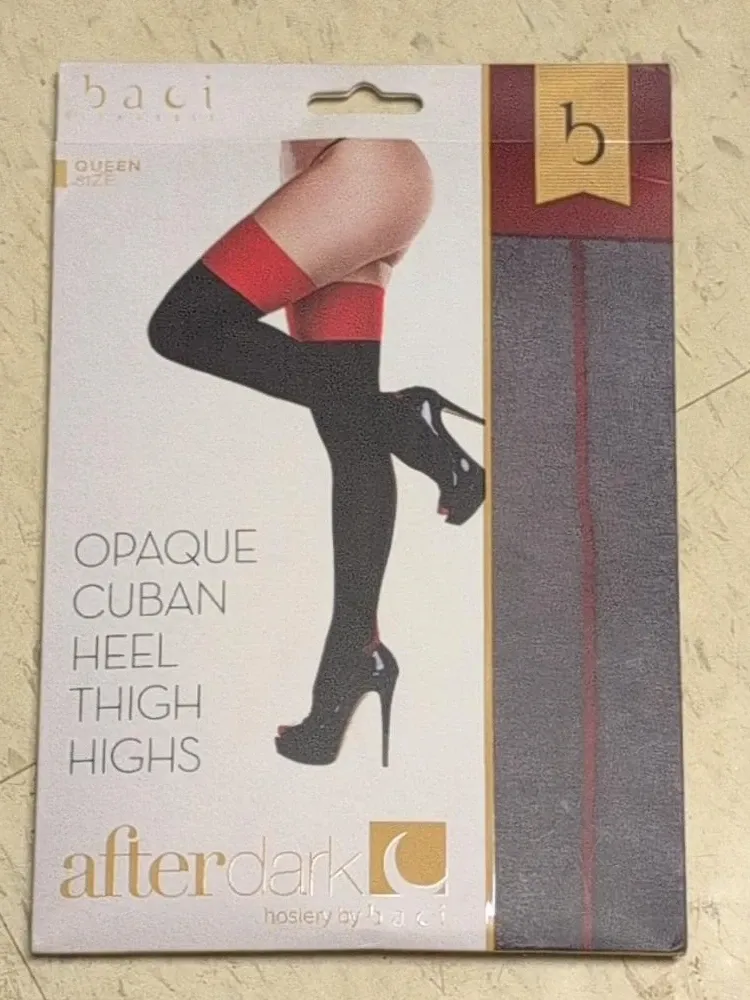 These are Baci After Dark opaque Cuban heel thigh highs. They are queen size and feature a red band at the top. Perfect for adding a retro flair to an outfit!