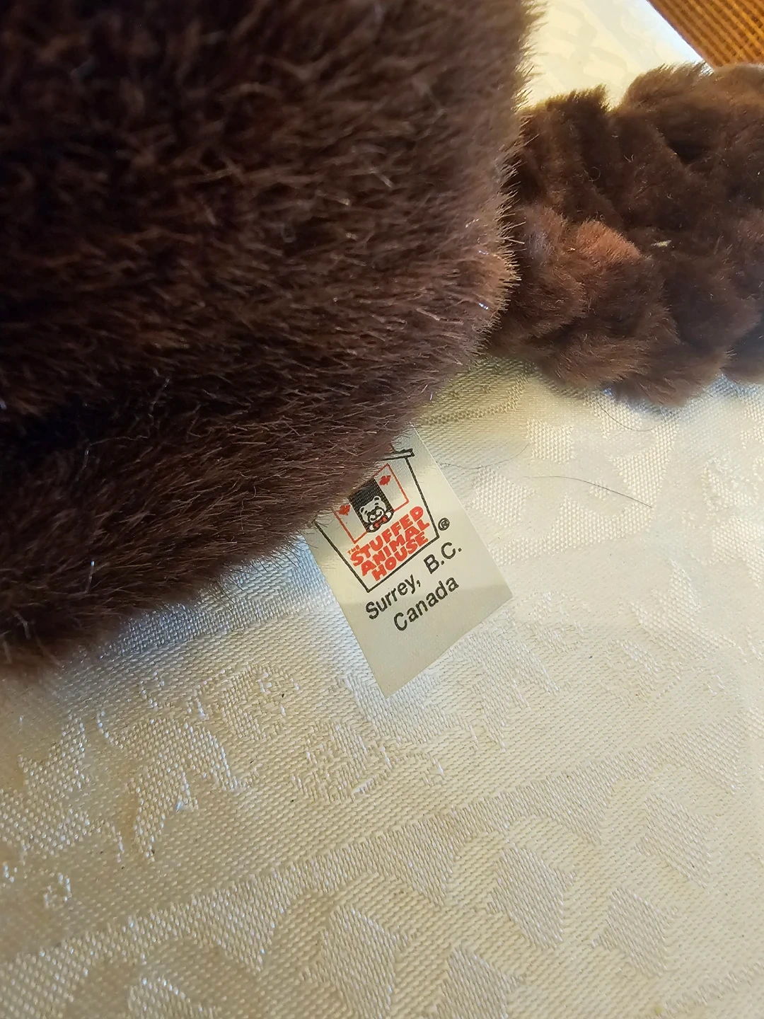 This is a soft stuffed beaver plush toy. It's made by Stuffed Animal House in Surrey, B.C., Canada. It's a cute toy for kids or collectors!