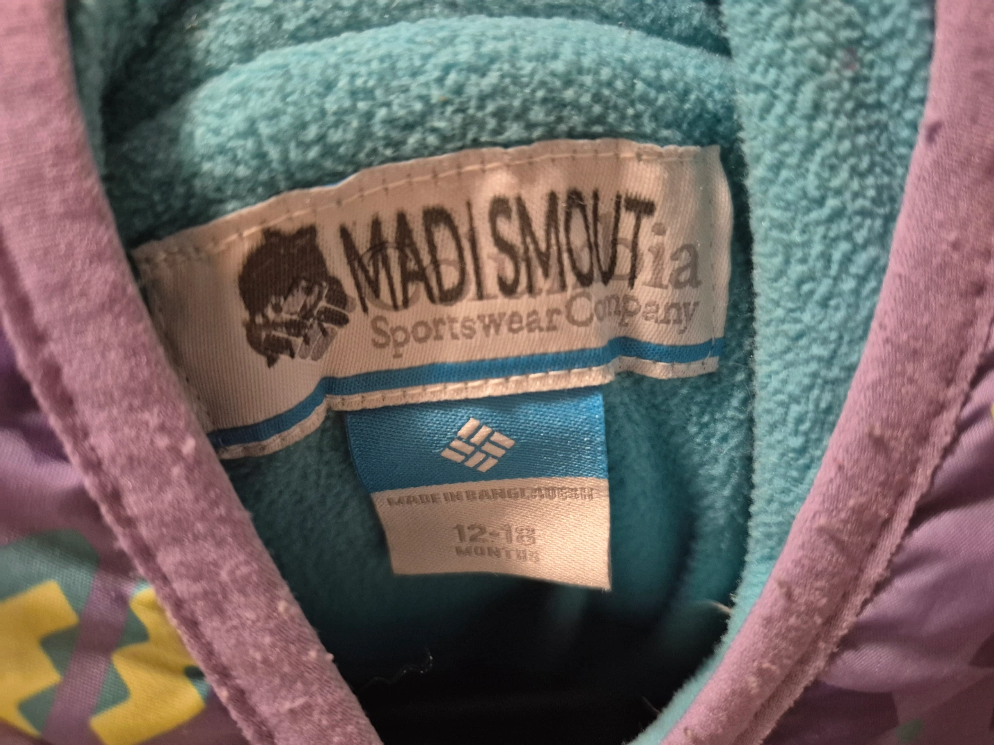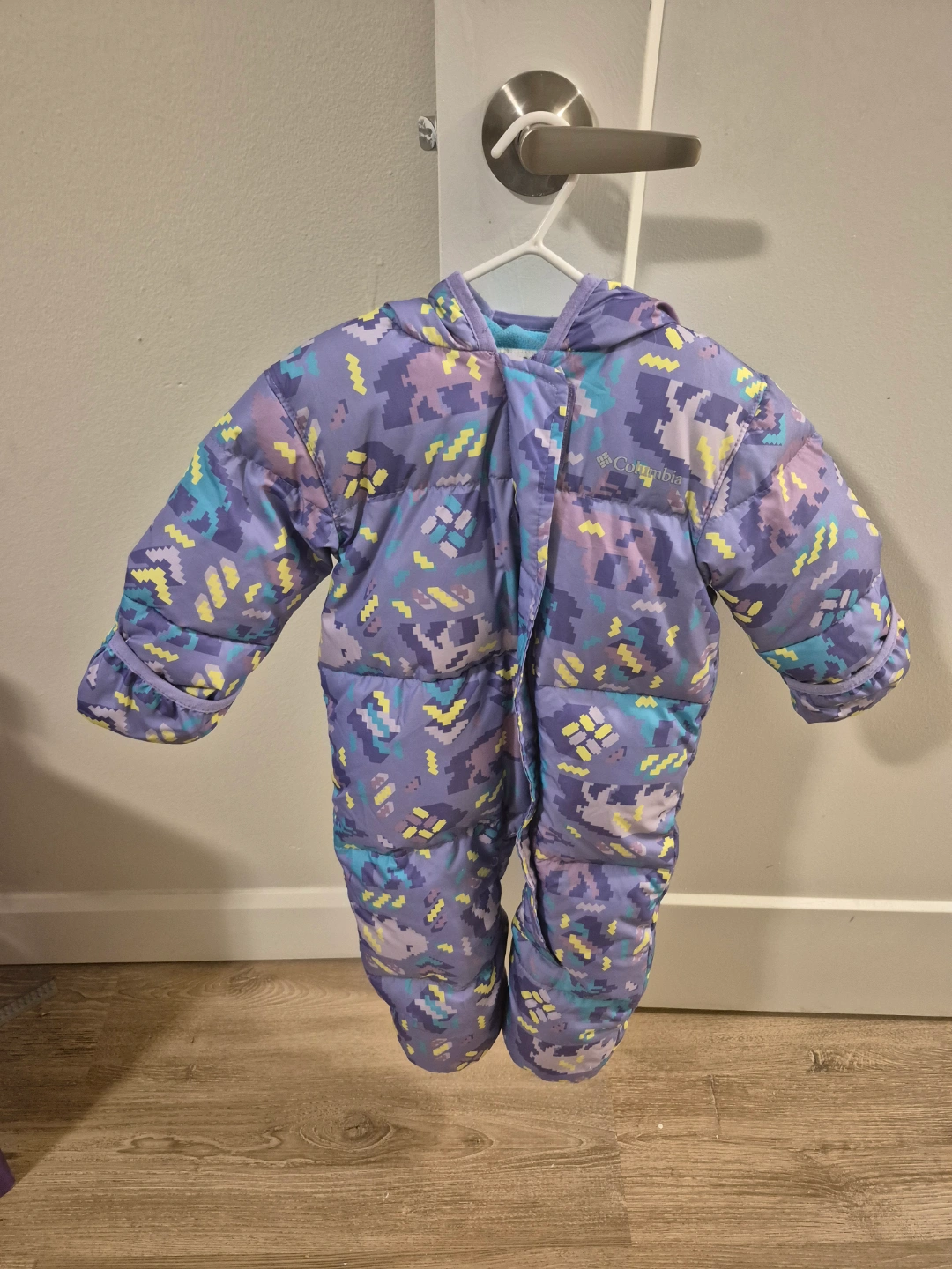 Adorable Columbia baby snowsuit. Size 12-18 months. Purple with colourful geometric print. Warm and cozy for winter adventures. Located in St Thomas