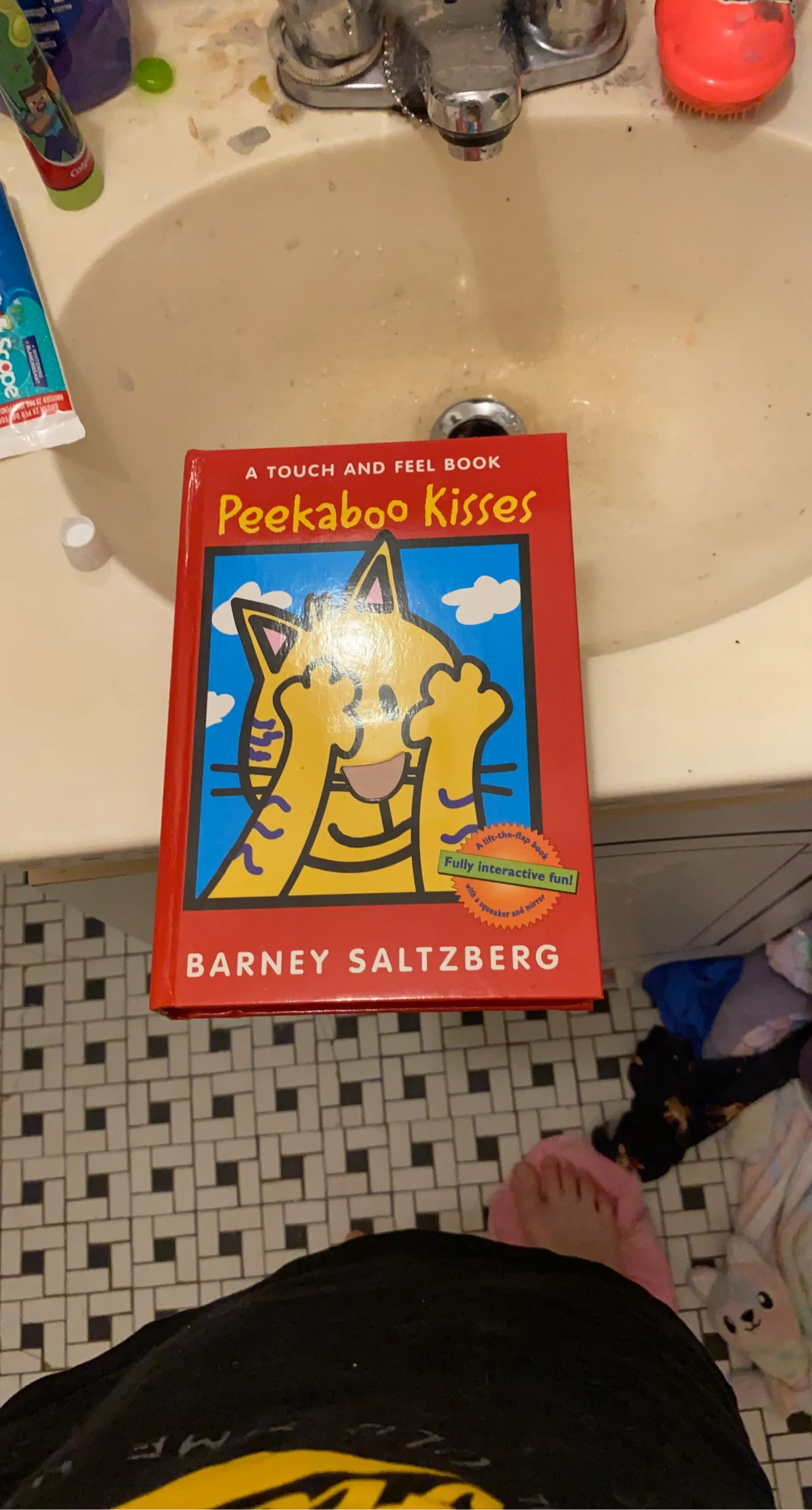 This is a touch and feel book titled Peekaboo Kisses. It's a lift-the-flap book with interactive fun. It includes a squeaker and a mirror. Perfect for little ones to explore! Also ripped on 1 page