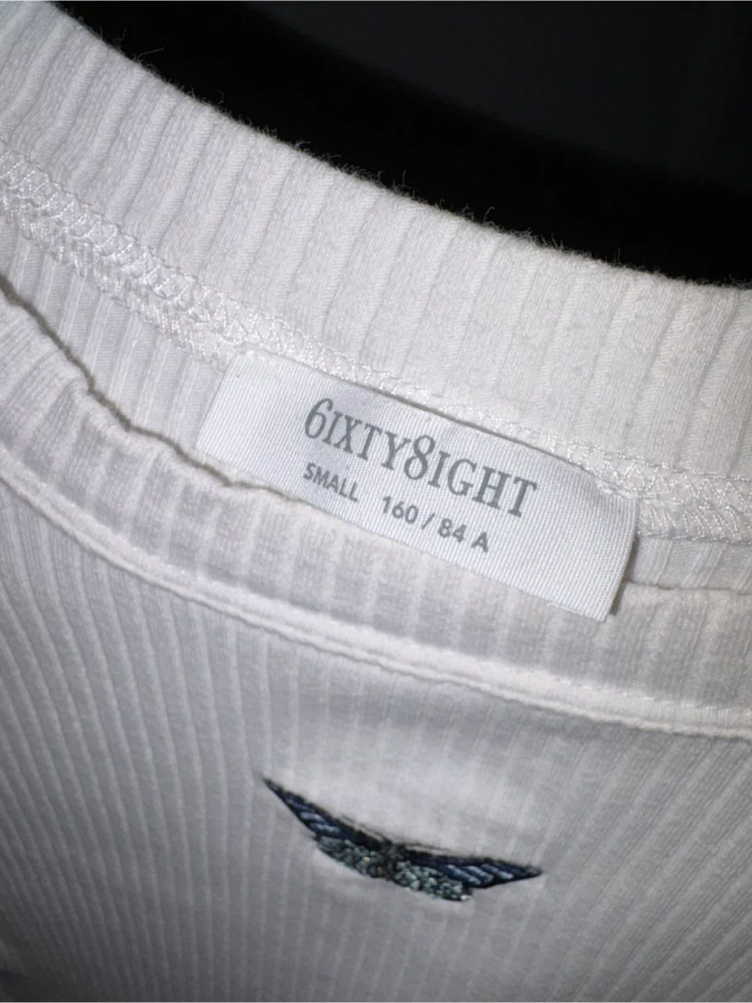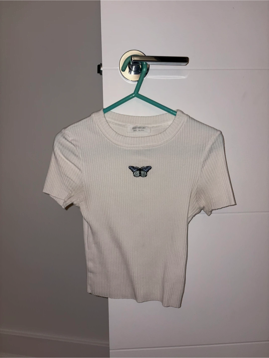 White ribbed crop top from 6ixty8ight. It has a small embroidered butterfly graphic on the front. Ribbed material with short sleeves.