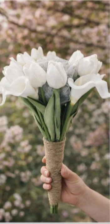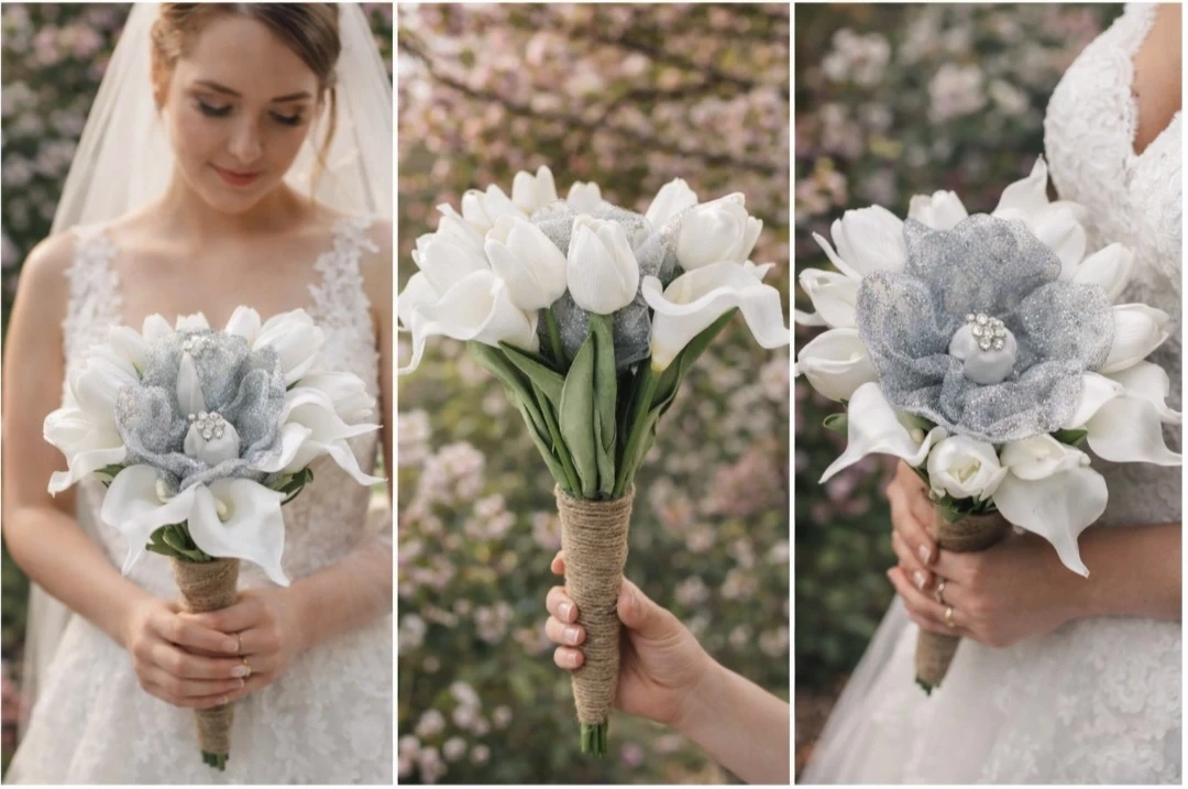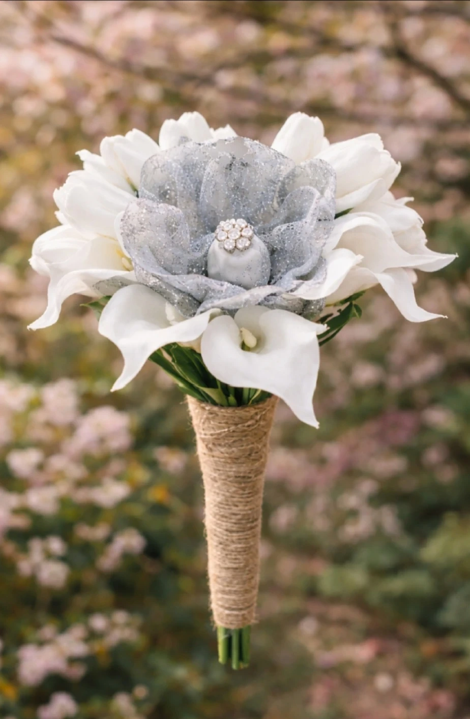 Beautiful artificial wedding bouquet with white calla lilies and tulips. It features a sparkly silver accent flower with rhinestone details. The handle is wrapped in natural jute twine. This bouquet is perfect for a bride's special day!