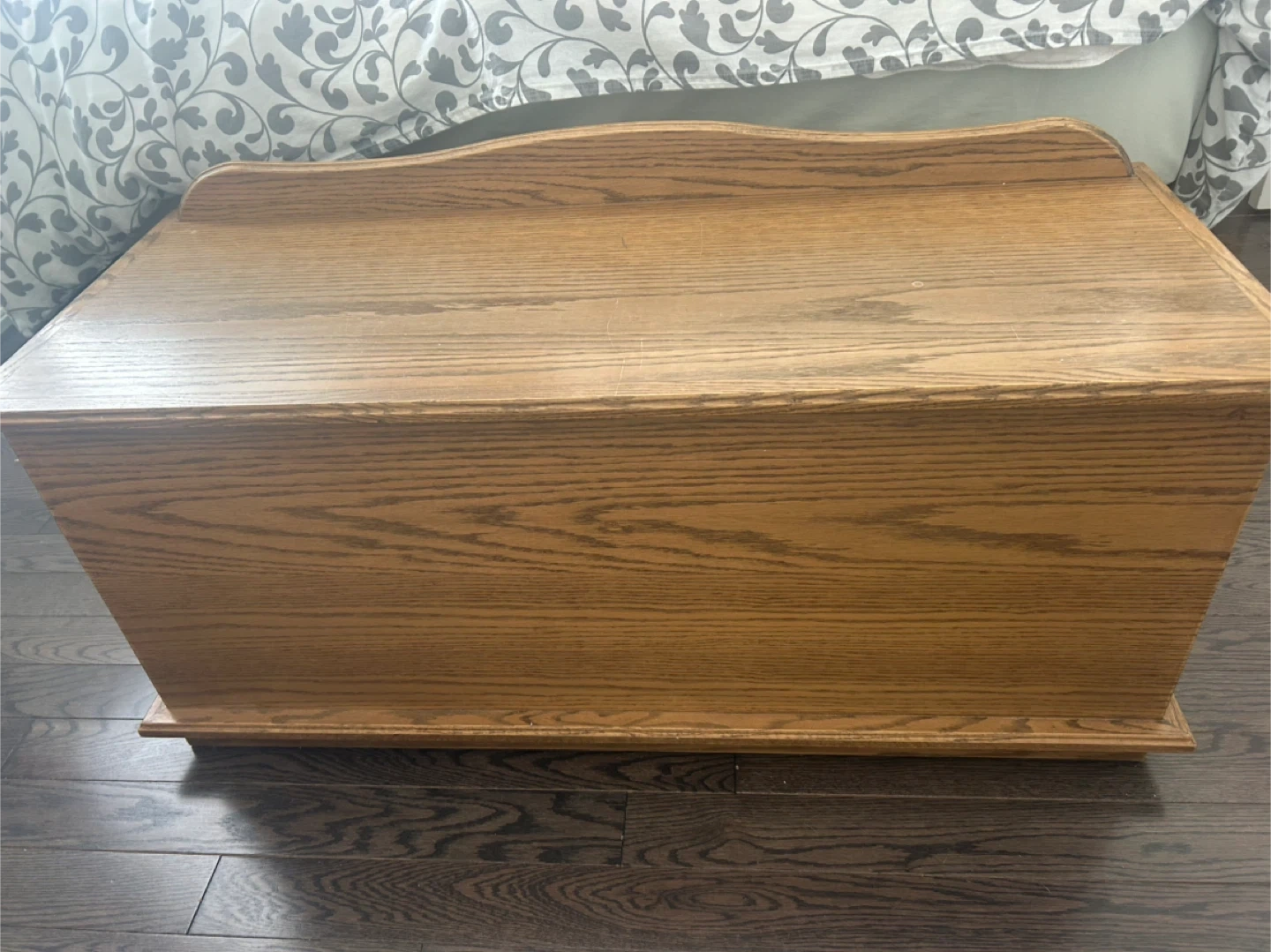 This wooden blanket box is made of oak veneer. It's perfect for storing blankets, linens, or other household items. The hinged lid provides easy access to the spacious interior.