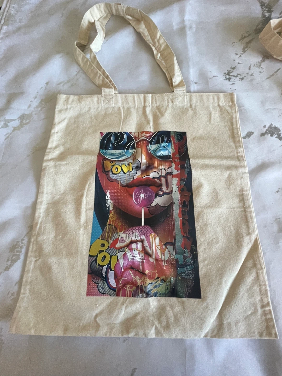 Canvas tote bag featuring a vibrant graphic print. This reusable bag is made of durable canvas material. It's a great accessory for everyday use! I have three. They are $5.00 each