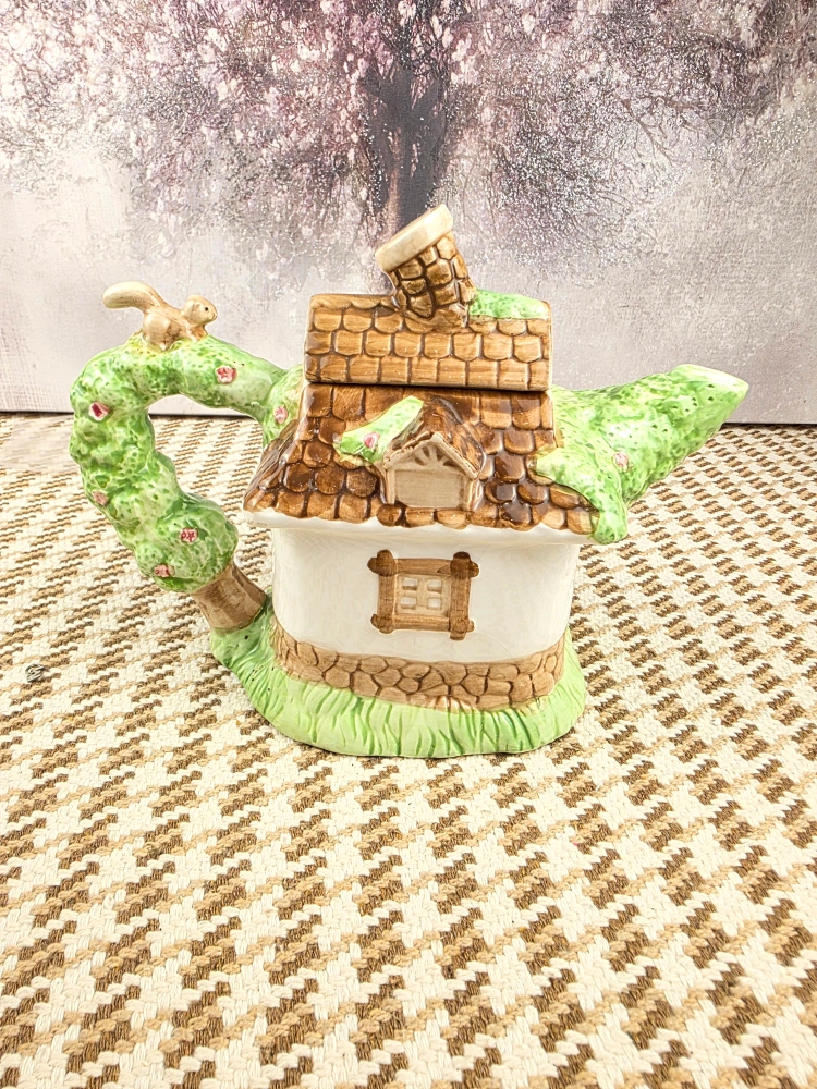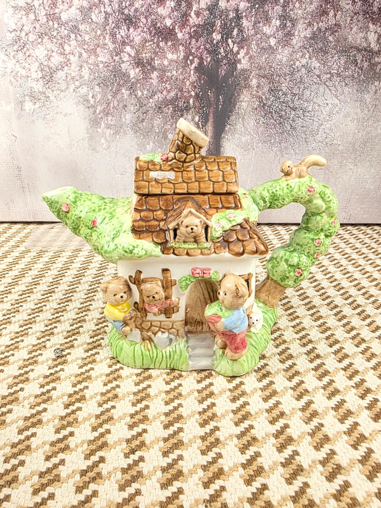 Adorable cottage-shaped teapot. Green handle and spout, shaped like leaves. The roof is brown, with a small chimney. It is decorated with teddy bears. This item will be great for a soothing afternoon tea.