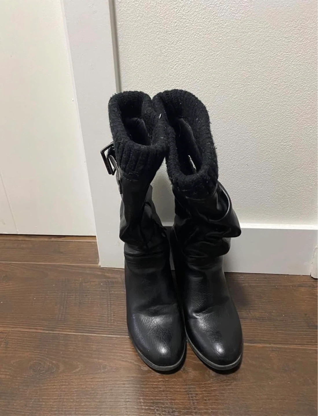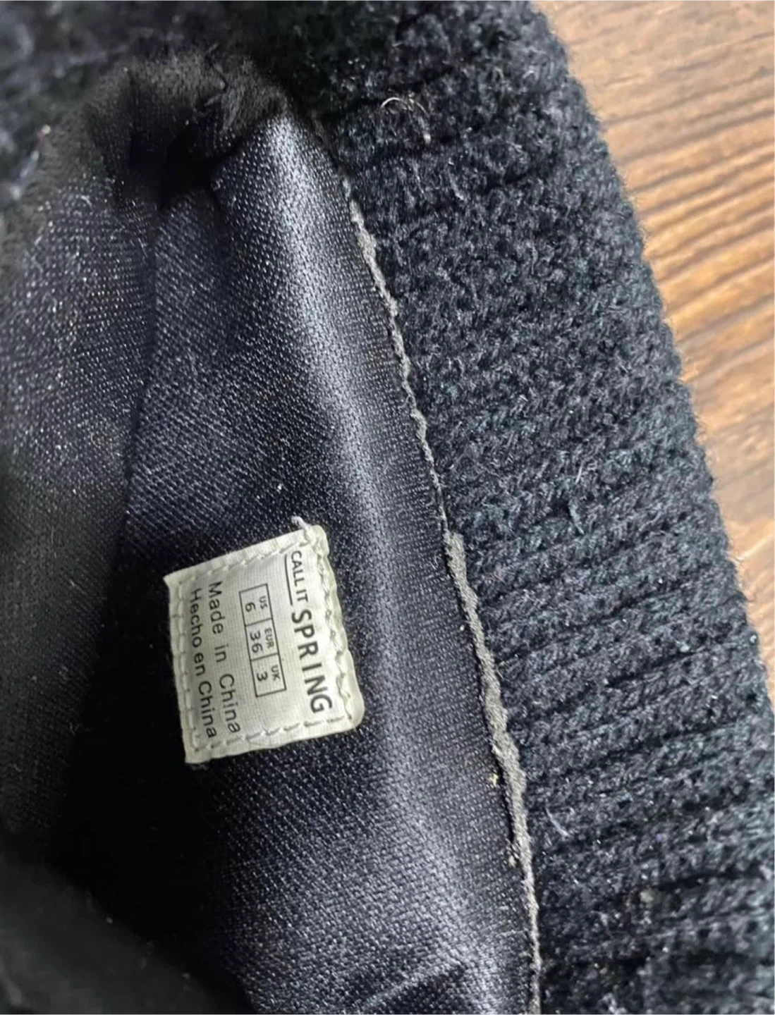 These Call It Spring wedge boots are black and a size 6.5. They feature buckle details and a faux fur lining. Perfect for keeping your feet warm and stylish during colder weather!