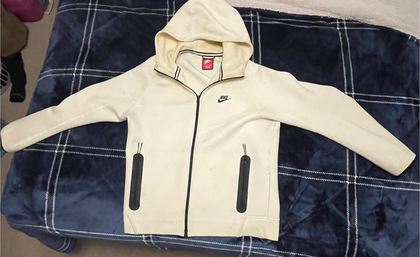 This is a Nike Tech Fleece full zip hoodie in a cream colour. It's a size large and made in Cambodia. It features a full zip closure and zippered pockets. The hoodie is in good condition only worn once and never wore it again because it didn’t fit me so yea it’s basically brand new and this is a unique colour no one really have this so please feel free to dm me if you interested