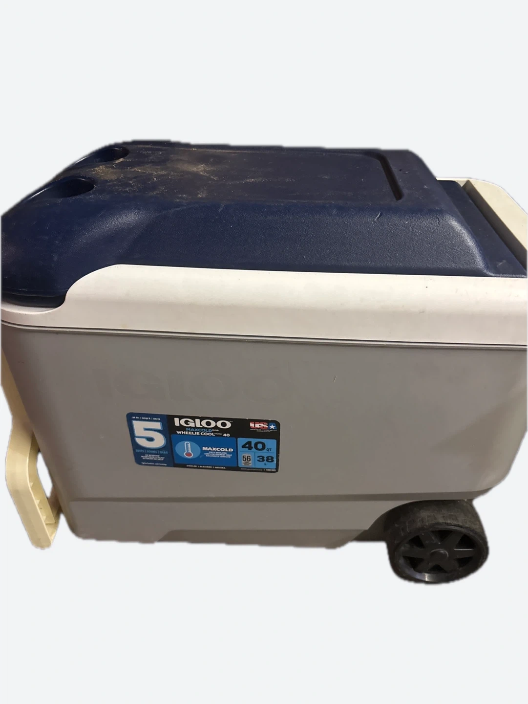 Selling an Igloo Maxcold Wheelie Cool 40 cooler. It's a 40 quart cooler with wheels, making it easy to move around. Great for camping, picnics, or any outdoor event