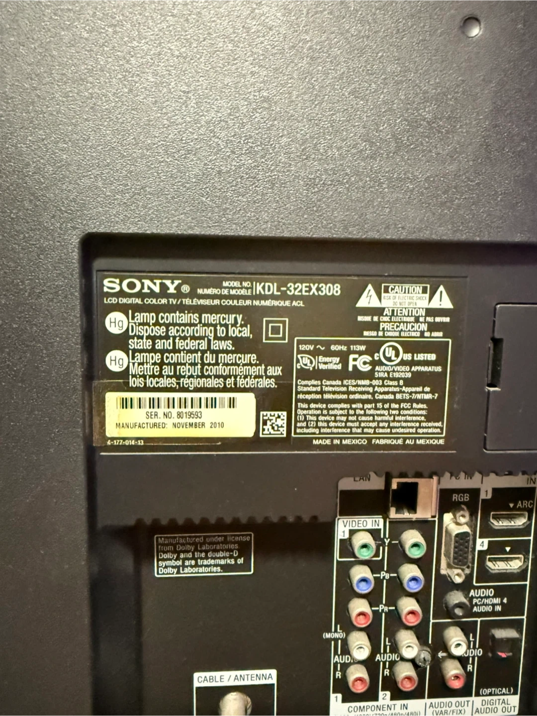 This is a Sony BRAVIA KDL-32EX308 LCD TV. Manufactured in November 2010. It's a 32-inch screen. This TV is great for bedrooms or smaller living spaces!