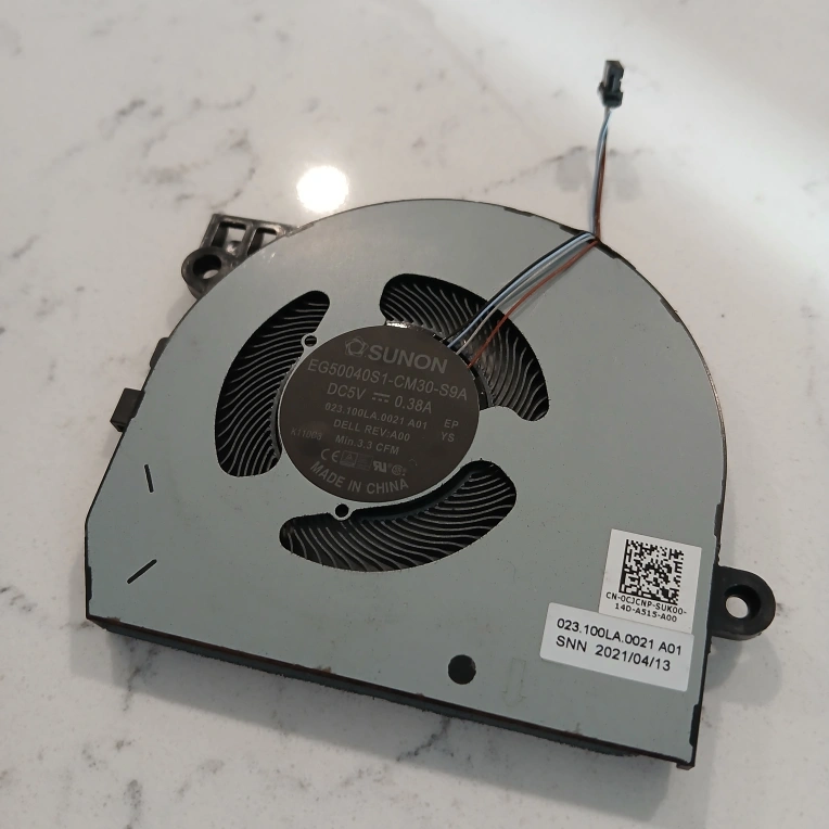 brand new fan for Dell laptop cooling. Model number EG50040S1-CM30-S9A. SUNON brand. 5V, 0.38A. Min 3.3 CFM. Includes wiring. Made in China.