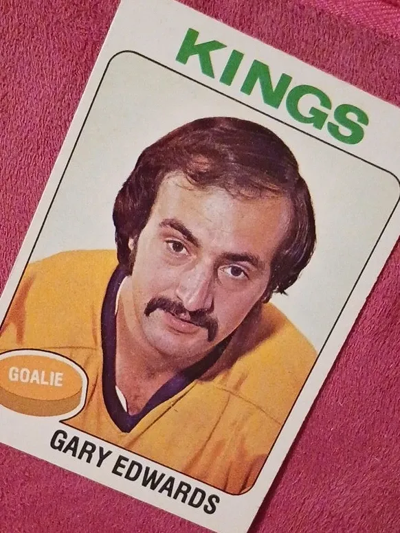 This is a Gary Edwards hockey card for the Los Angeles Kings. It identifies him as a goalie. Card is in good condition.