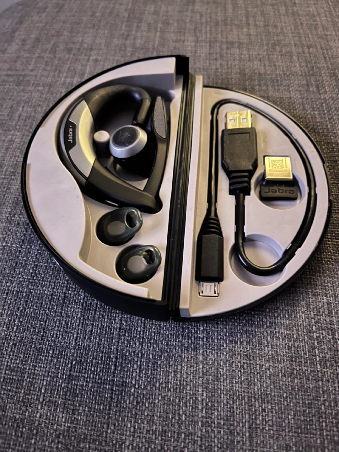 Wireless headset with charging case and USB cable. Includes extra ear tips. Excellent sound quality. Great for calls and music. Cash only Pickup only