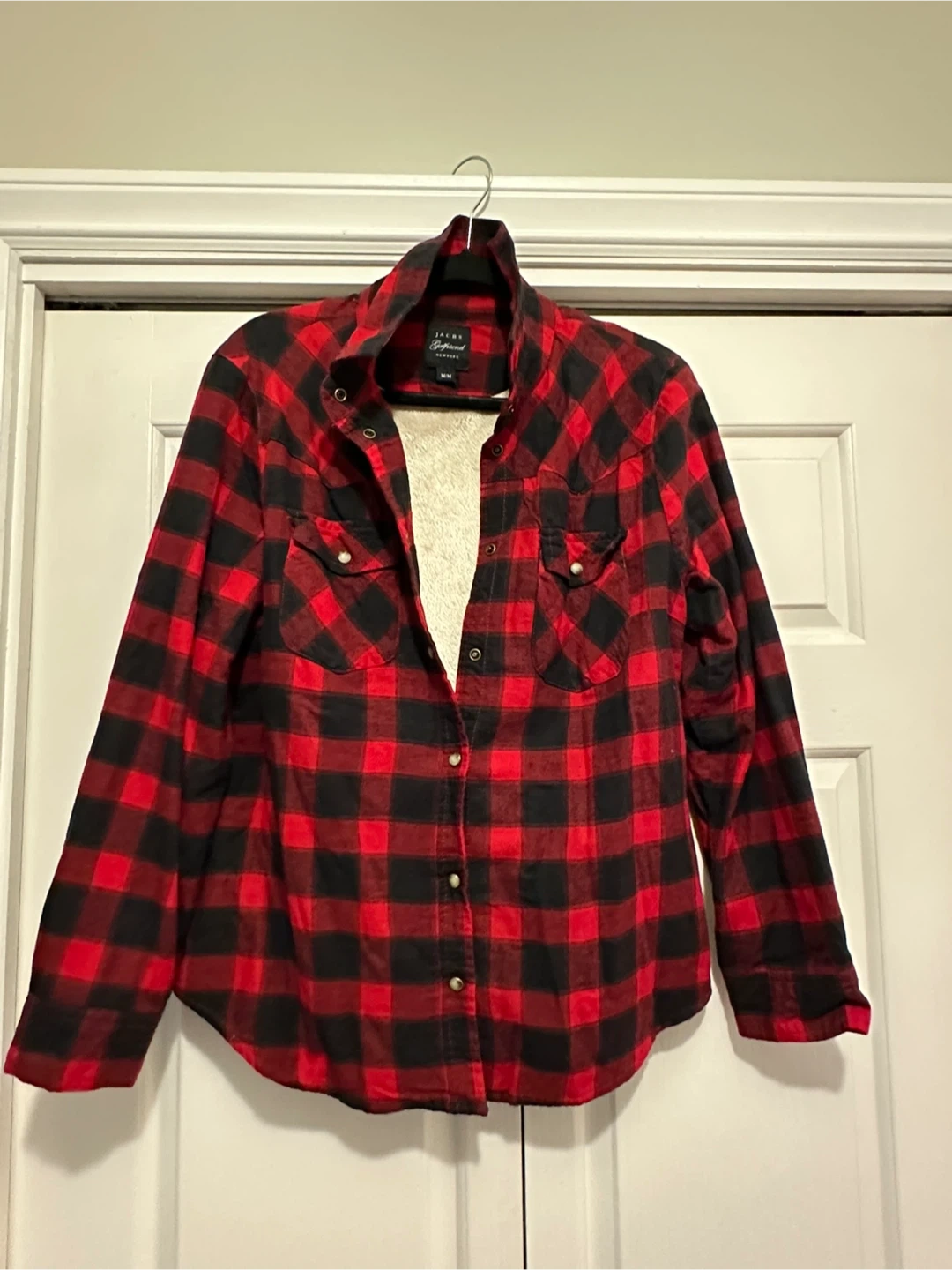 Cozy up with this Jachs Girlfriend flannel light jacket! It's a medium/medium size and features a classic red and black plaid pattern. The sherpa lining adds extra warmth, making it perfect for chilly days. Great for layering or wearing on its own!