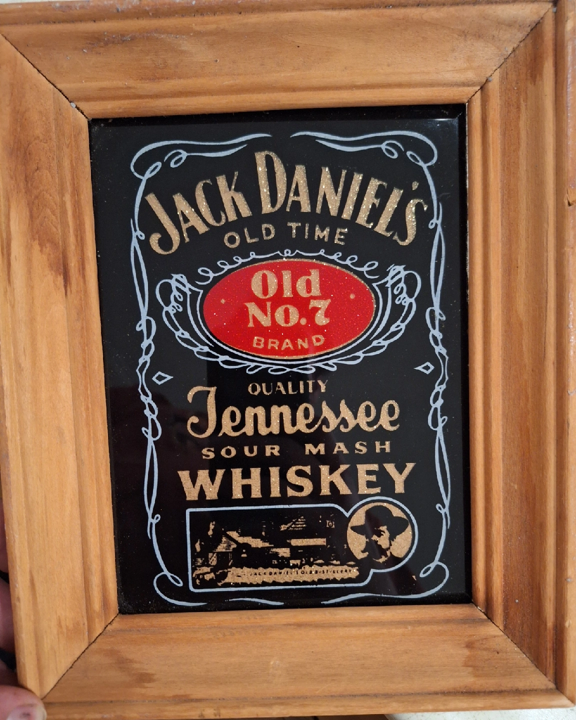 10Here's a framed piece of art featuring Jack Daniel's Old No. 7. It's a nice decorative item for a bar or a Jack Daniel's enthusiast's collection. The frame is a light wood colour, and the design has a vintage feel to it