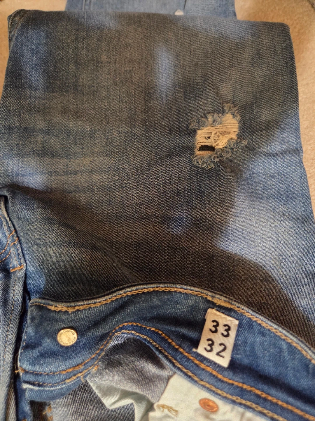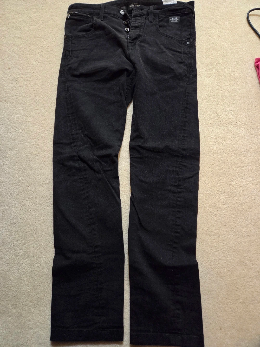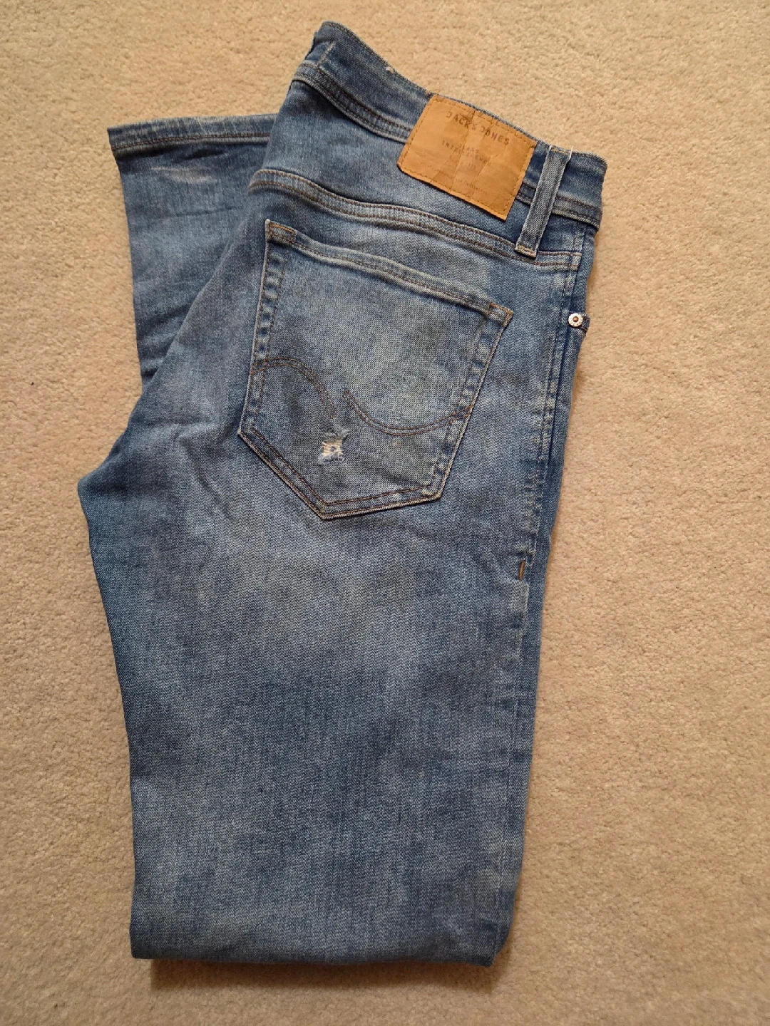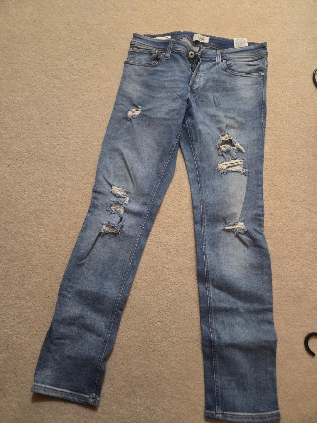 421Selling a pair of Jack & Jones jeans, size 33/32. One pair is blue denim with some distressed detailing. The other is black, size 31/32. Both are in good condition and ready for a new home!