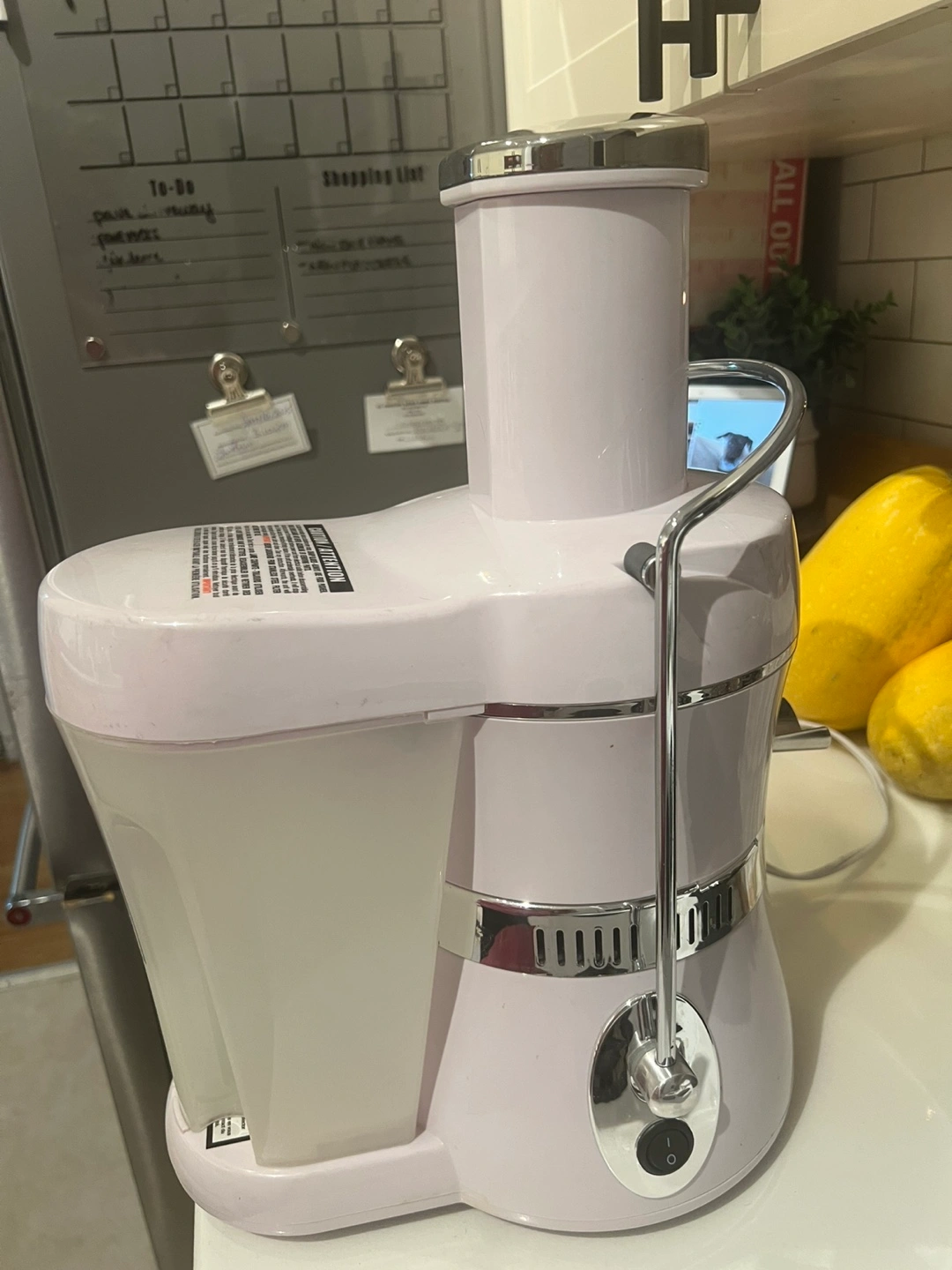 111Tristar Products Inc. model MT-1020-1. White colour. Includes pulp container and juice receptacle. Features a safety switch outlet. Excellent for juicing fruits and vegetables.