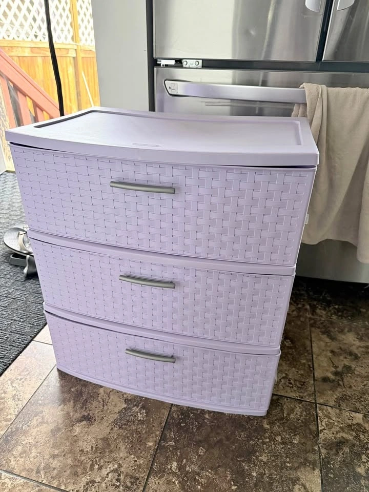 Handy purple 3-drawer storage cart with a woven texture on the drawers. Great for organizing clothes, crafts, or office supplies. Clean and ready for pickup. Approximately 50x55 cm.
