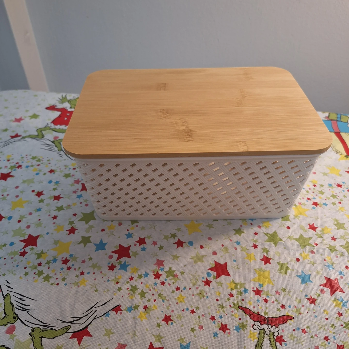Keep your space tidy with this cream white plastic storage basket! It comes with a stylish bamboo lid. It's ventilation-friendly and stackable, making it perfect for any room. The dimensions are approximately 10.02" x 7.19" x 4.24".