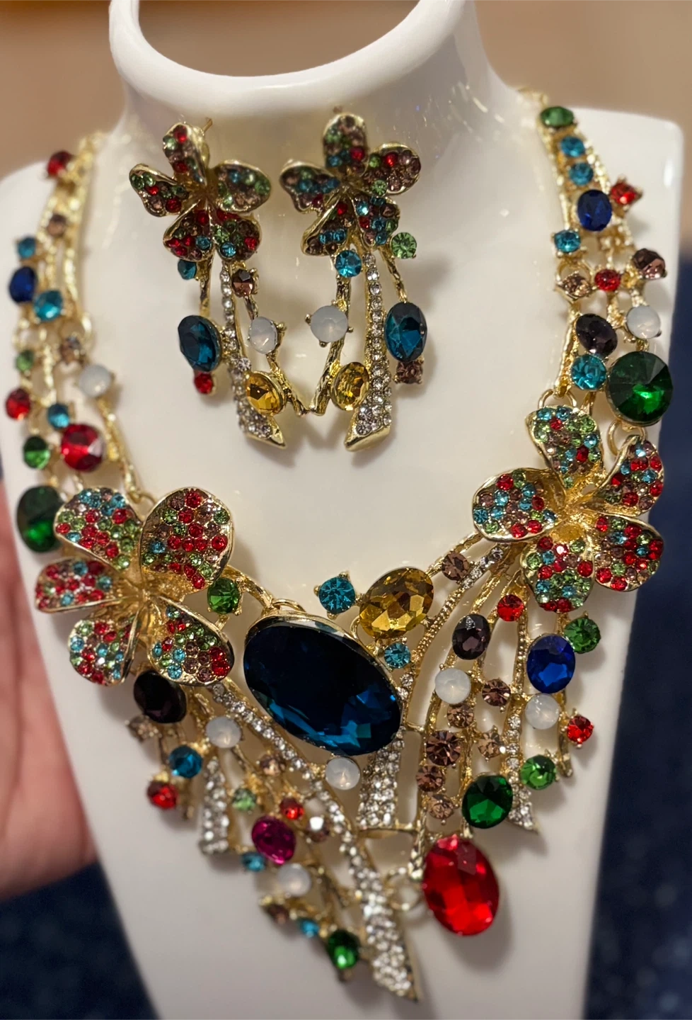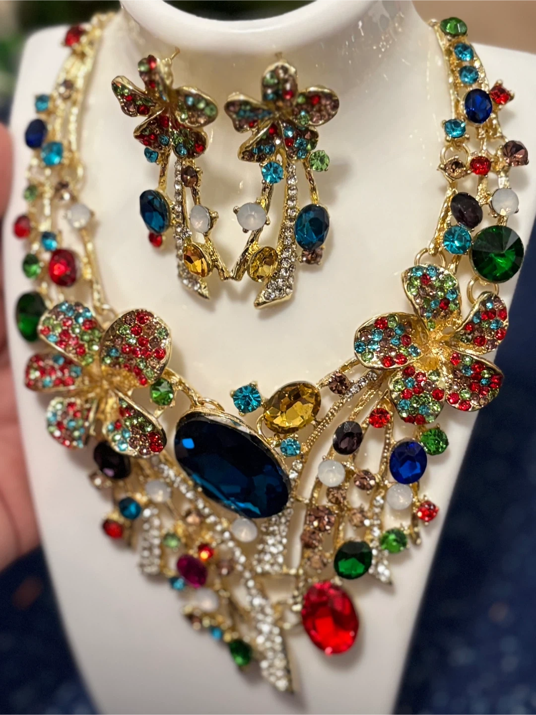 Sparkling multi-coloured rhinestone necklace and matching dangle earrings. Set features floral accents and a large central blue gemstone. Great for any events!